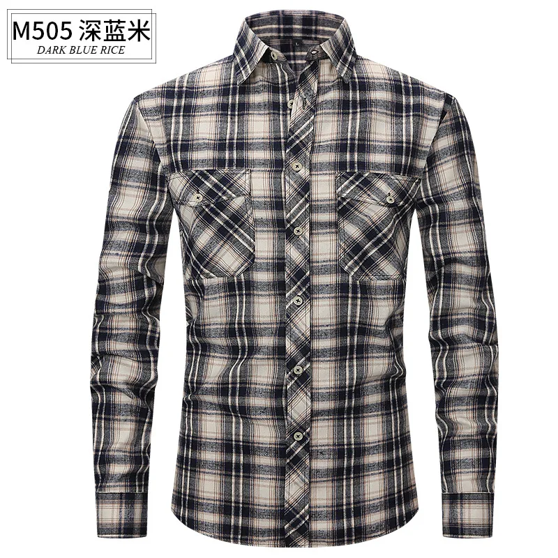 Men's Long-Sleeved Casual Flannel Wool Plaid Shirt Slim-Fit Double Pocket Spring/Summer Fashion Anti-Wrinkle Twill Fabric