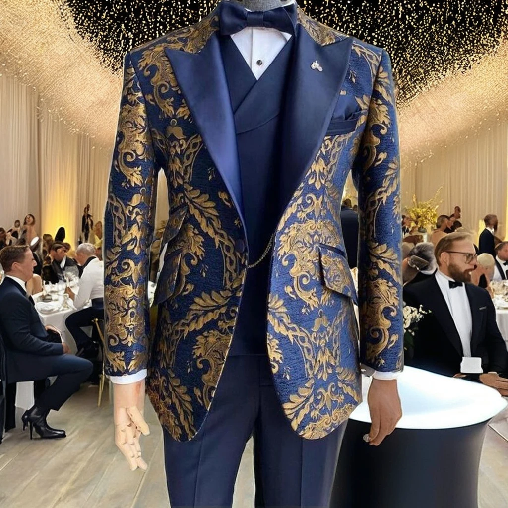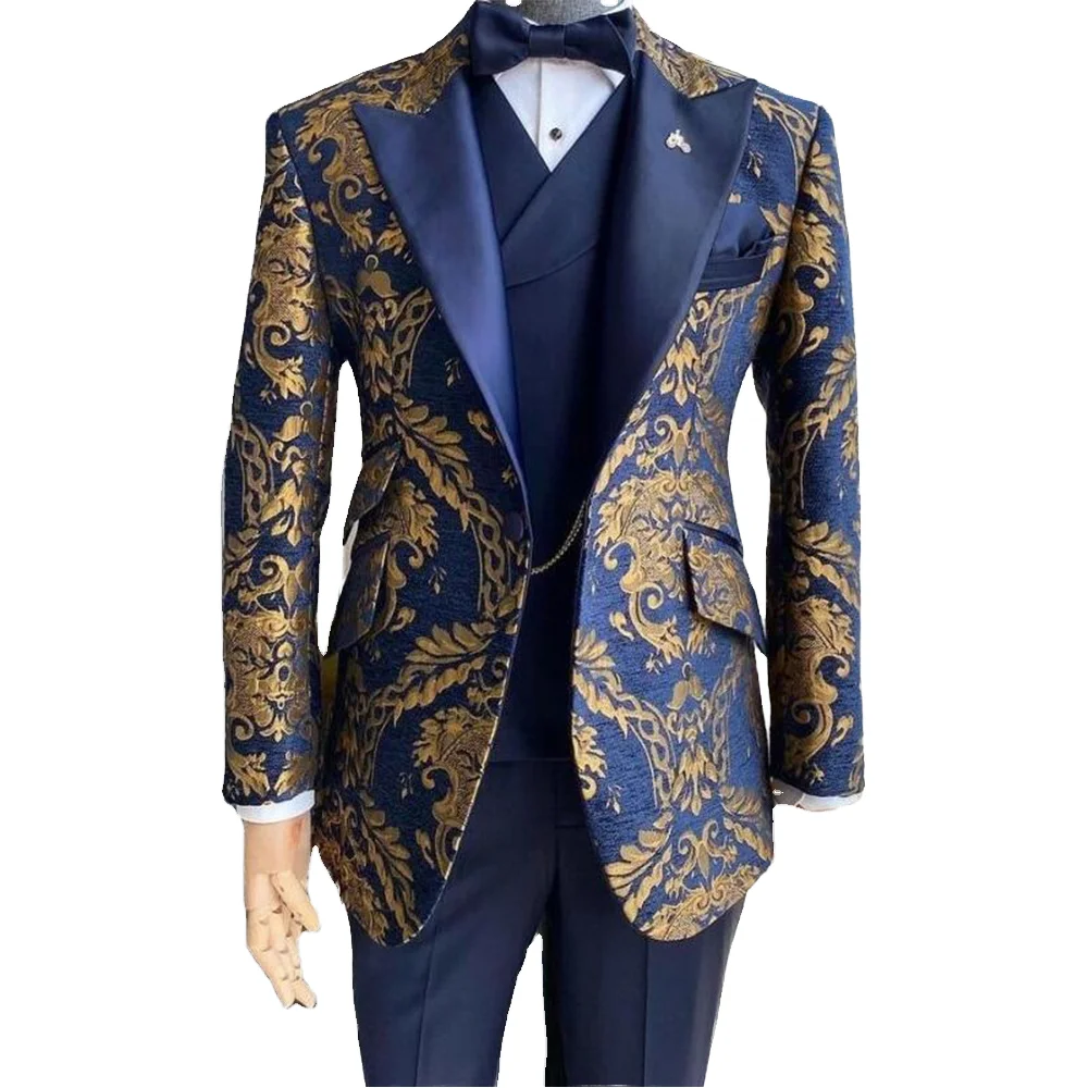 Jacquard Floral Tuxedo Suit for Men Navy Blue Slim Fit Wedding Gentleman Jacket Pant Single Breasted Plus Size 2 Piece Male