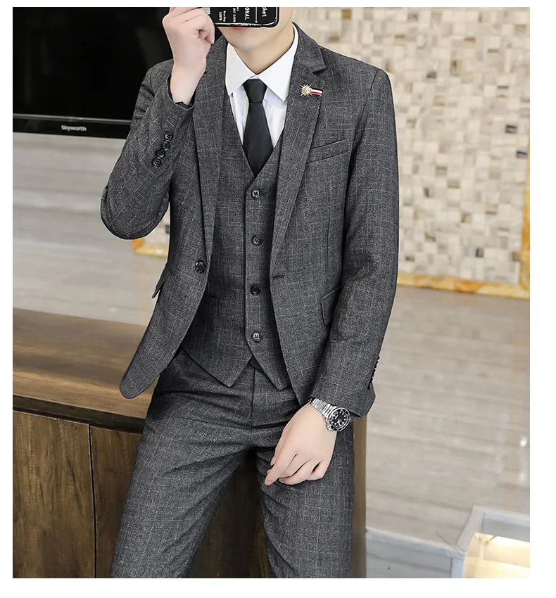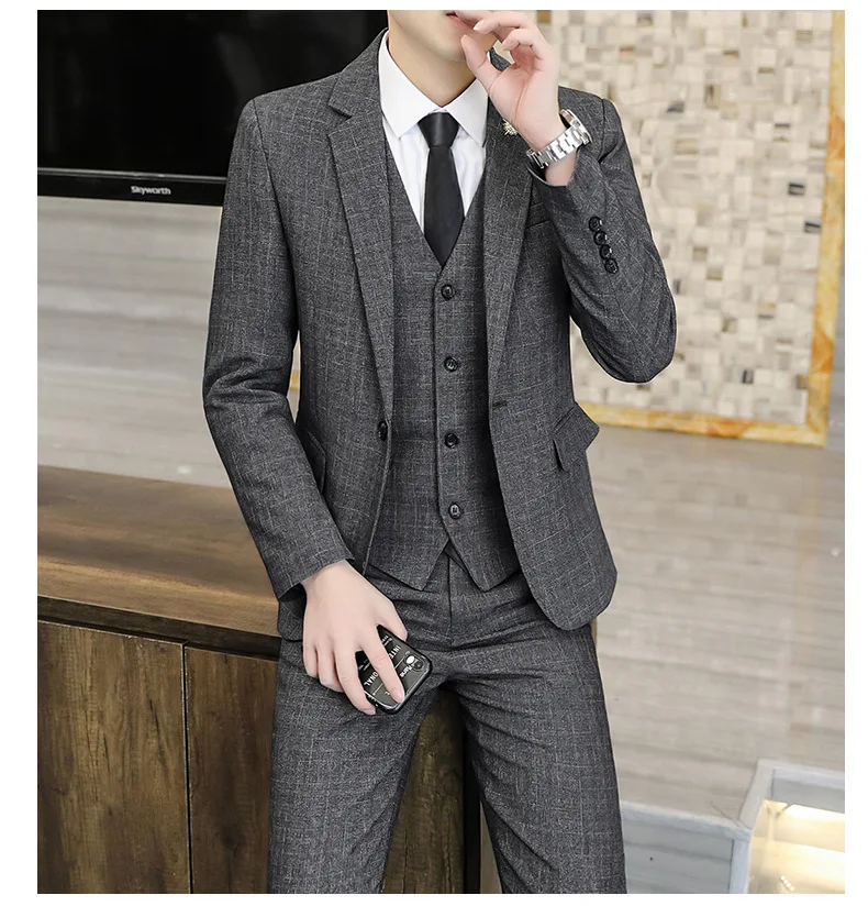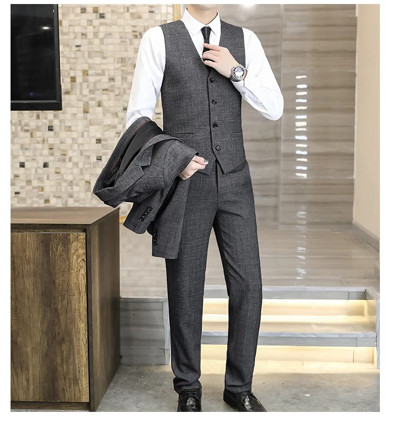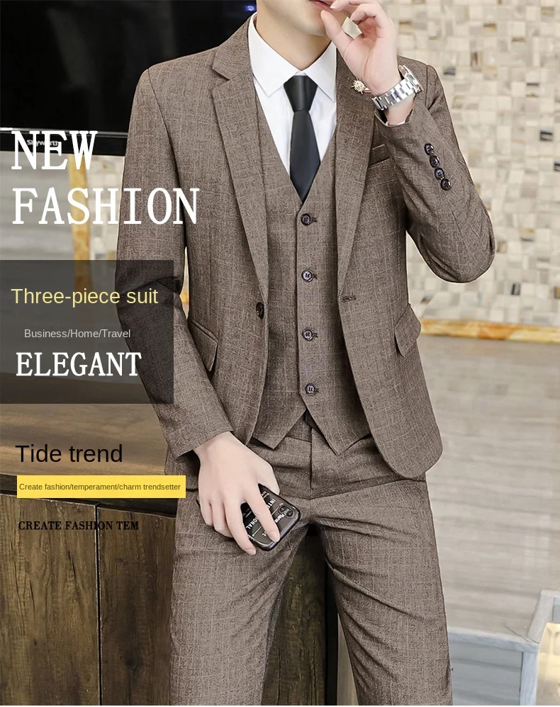 Men's Slim-Fit Three-Piece Tuxedo for Autumn Winter Business Casual Professional Formal Fashion Youth Wedding Groom Pants Zipper