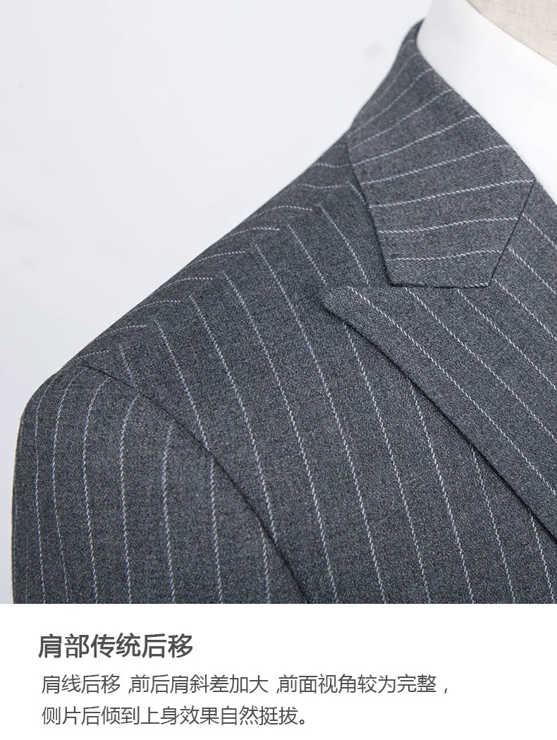 Men's Elegant Grey Striped Dress Suit Tailored Groomsman Blazer with Hip Lapel Collar Double Slit Single Breasted Closure Design