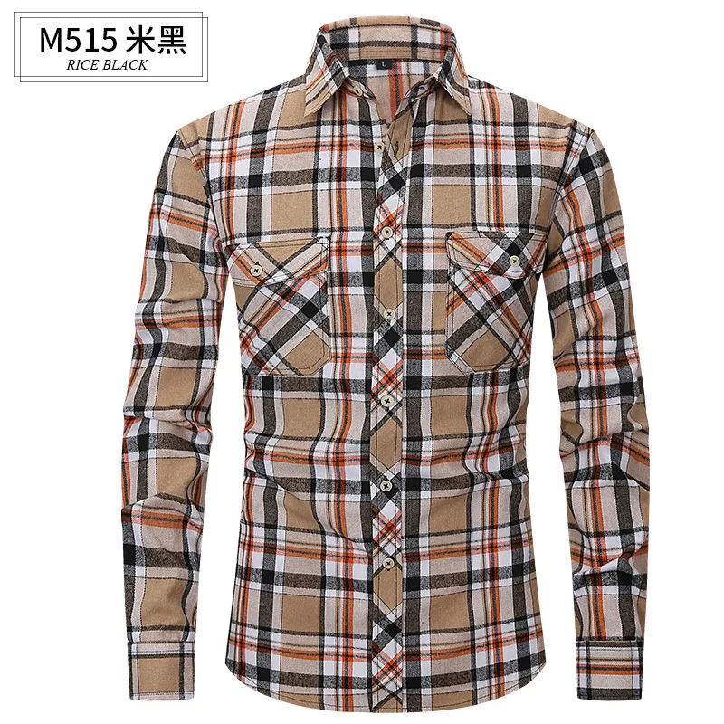 Men's Slim-Fit Flannel Plaid Shirt for Spring/Summer Twill Fabric Double Pocket Long-Sleeved Casual Anti-Wrinkle