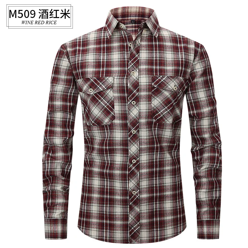 Men's Slim-Fit Flannel Plaid Shirt for Spring/Summer Twill Fabric Double Pocket Long-Sleeved Casual Anti-Wrinkle
