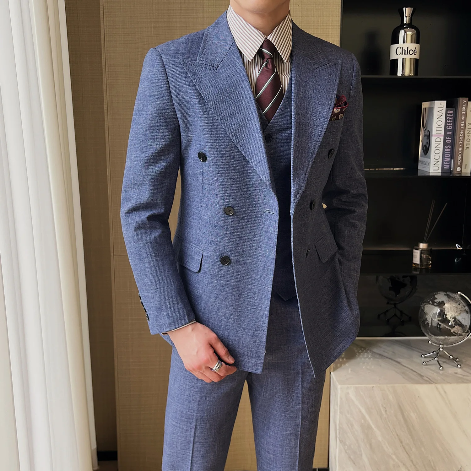 High-End Men's Double-Breasted Slim-Fit Suit with Double-Rolled Collar Formal Viscose Zipper Plus Size for Business Wedding