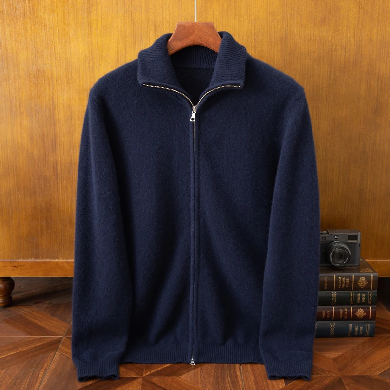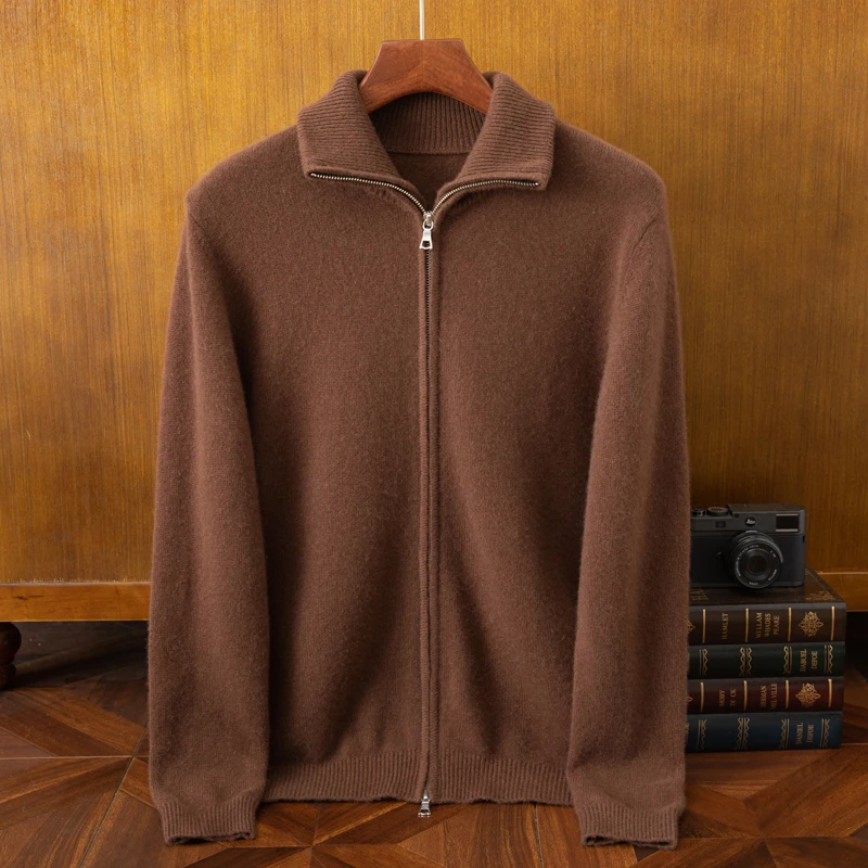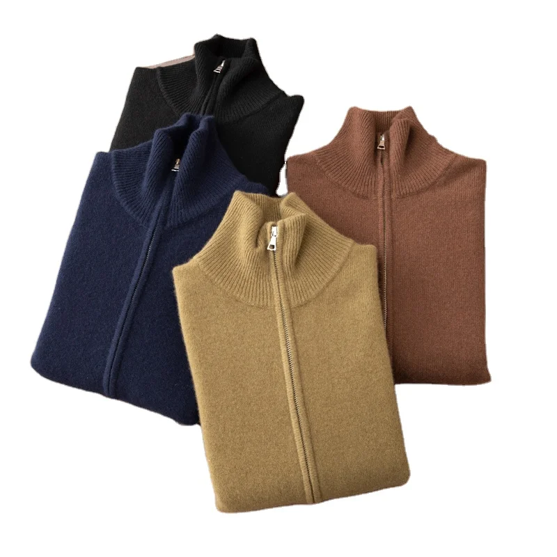 Men's Half High Neck Full Zipper Cashmere Breathable Anti-Pilling Quick Dry Knit Cardigan for Young Middle-aged Autumn Winter