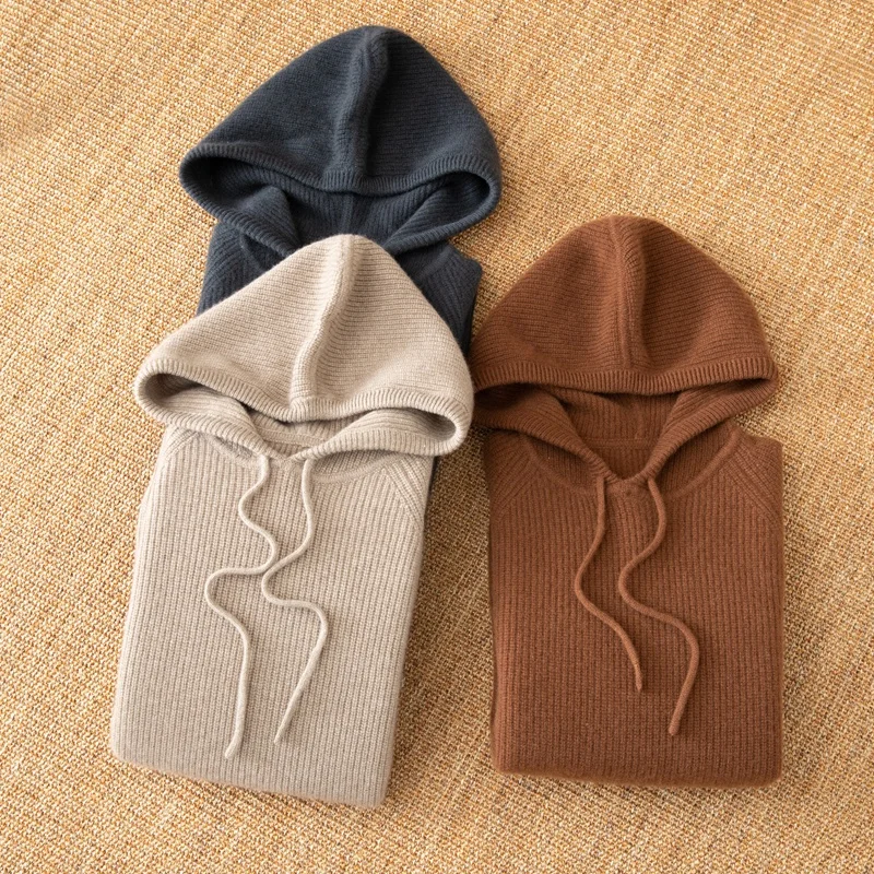 Men's Seamless Cashmere Hoodie Youth Fashion Solid Color Knitted Wool Pullover Soft and Lightweight Casual Sweater for Winter