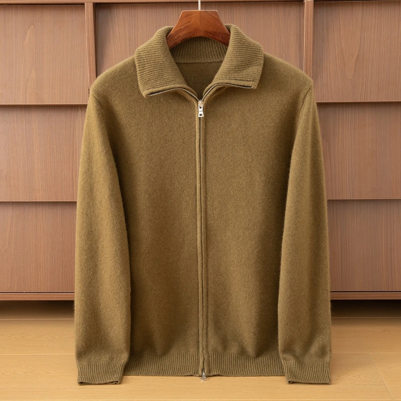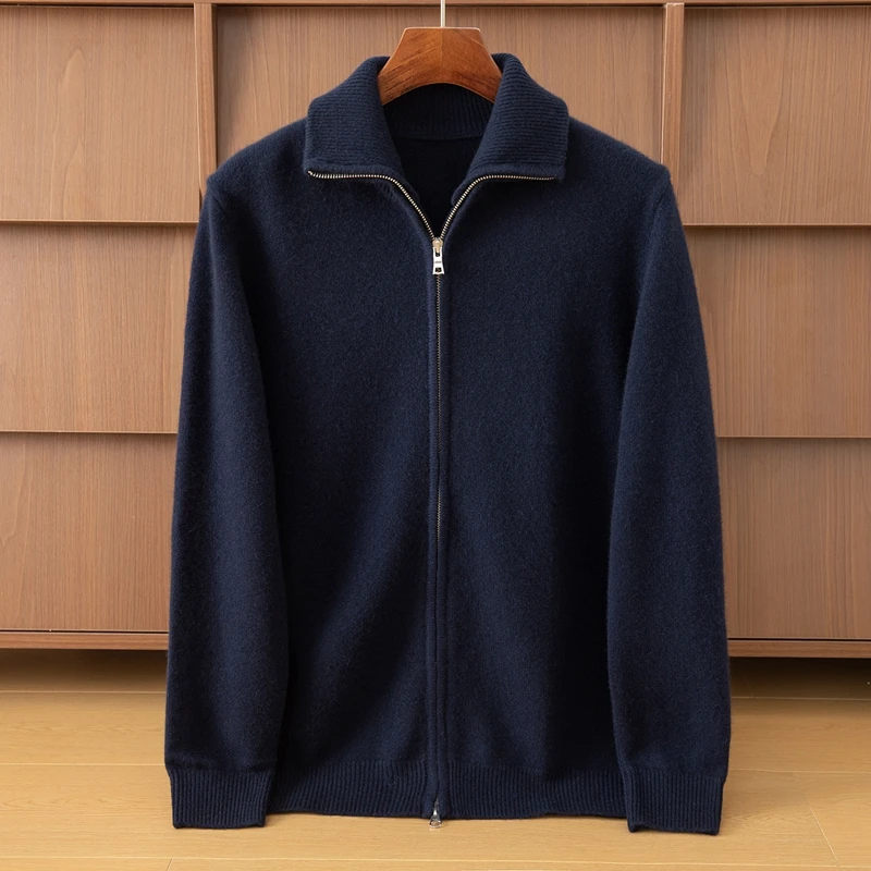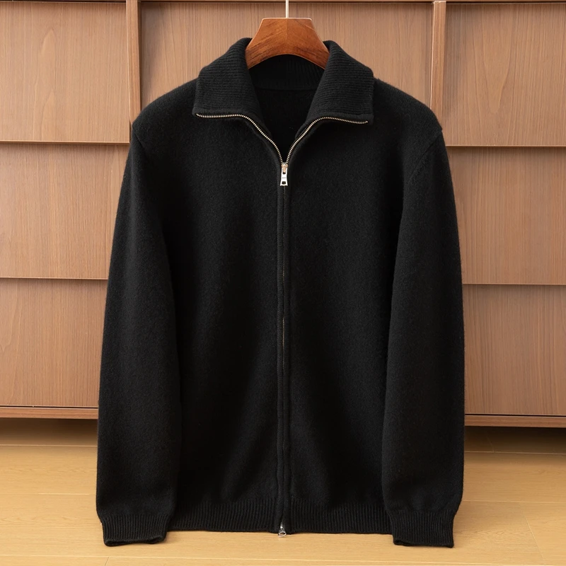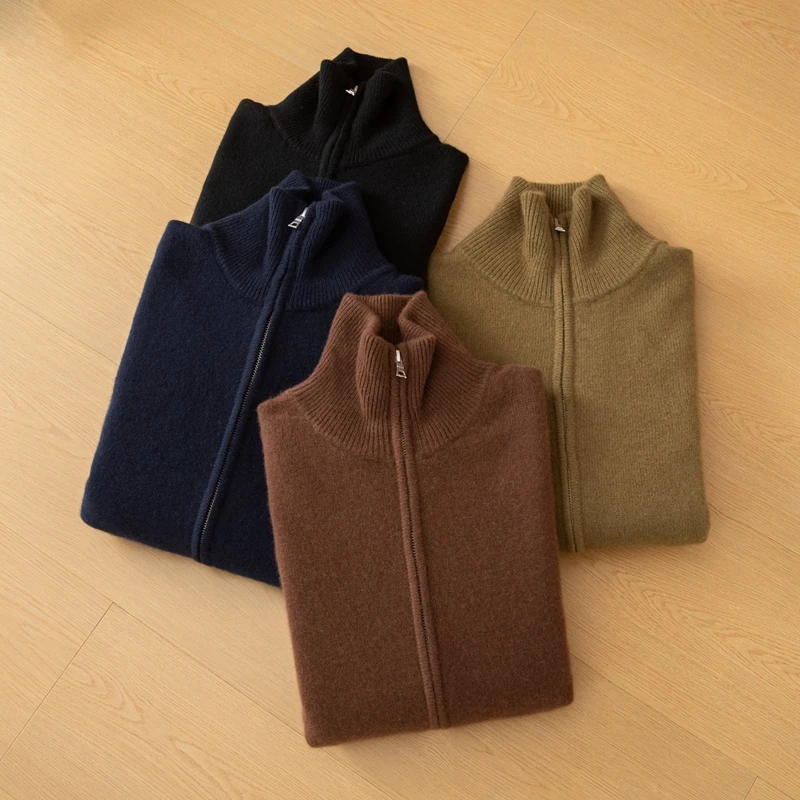 Men's Half High Neck Full Zipper Wool Cashmere Knit Cardigan Young and Middle-aged Autumn Winter New Front Logo Anti-Wrinkle