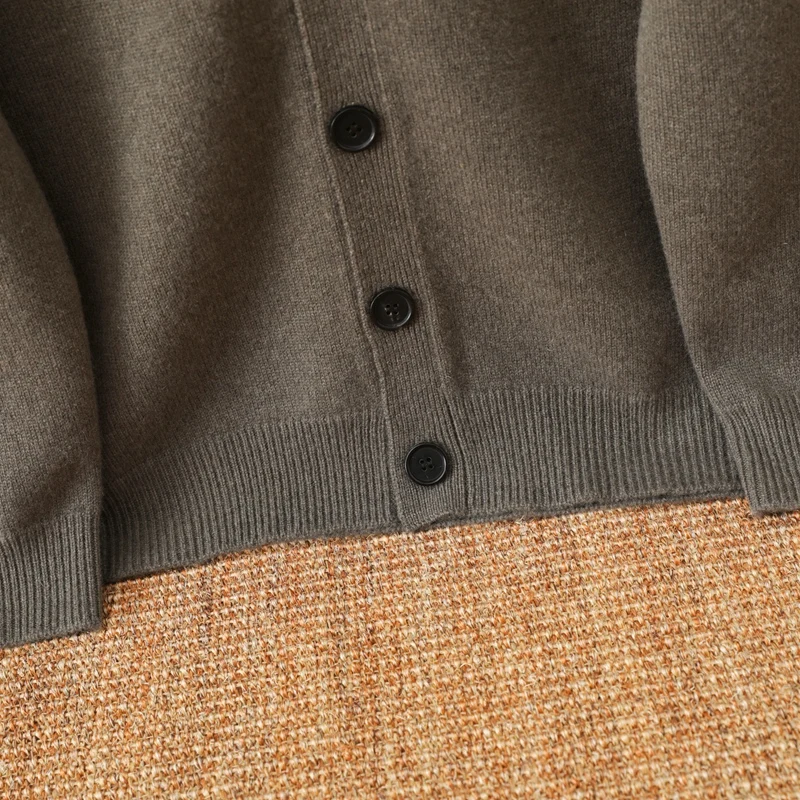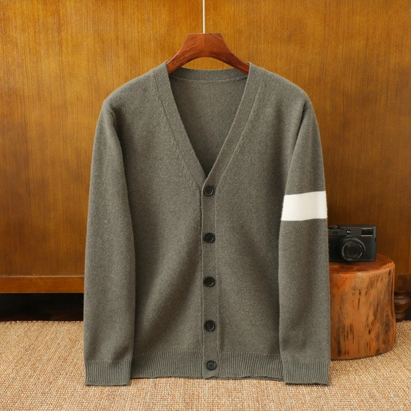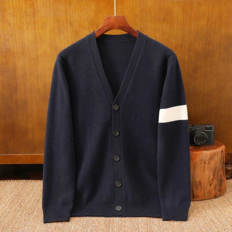Autumn Winter Men's 100% Pure Cashmere V-Neck Cardigan Jacket Business Casual Fashion Thickened Patchwork Button Plus Zipper