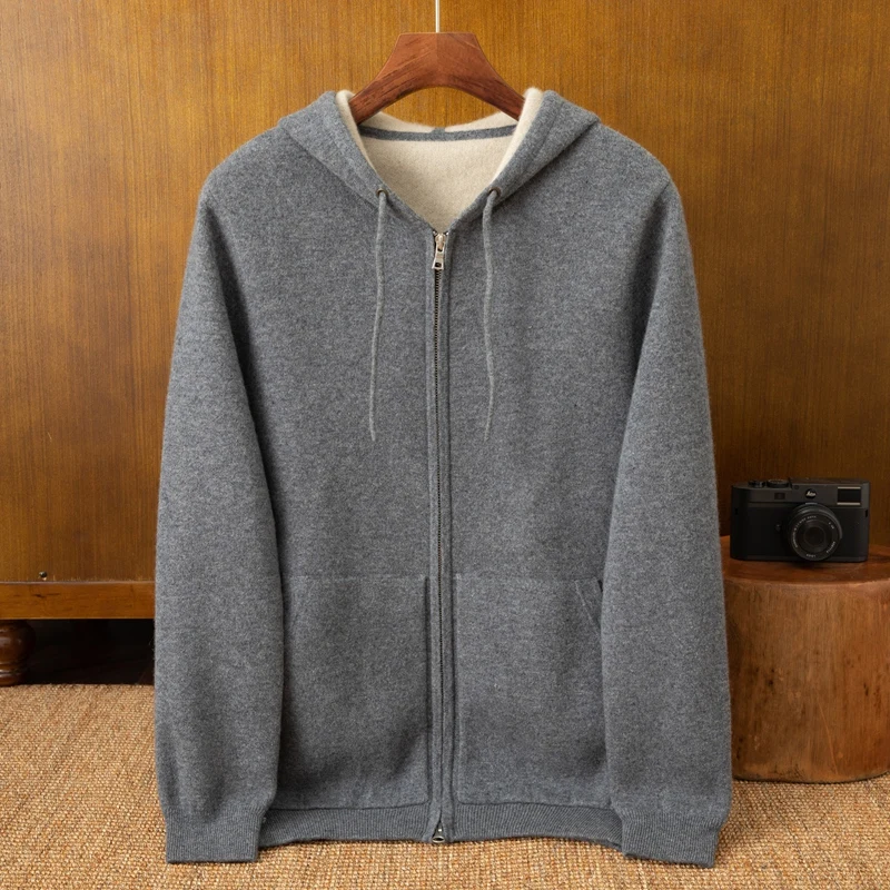 Men's Casual Hoodie 100% Cashmere ODM Sports Thick Cardigan with Simple Pocket and Pattern Decoration for Spring and Winter