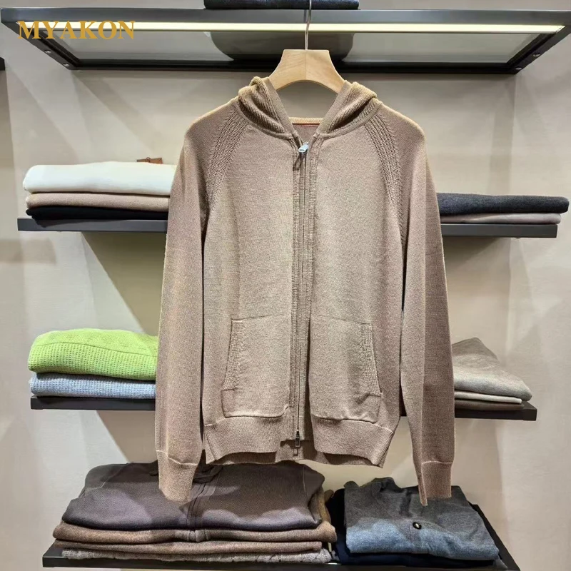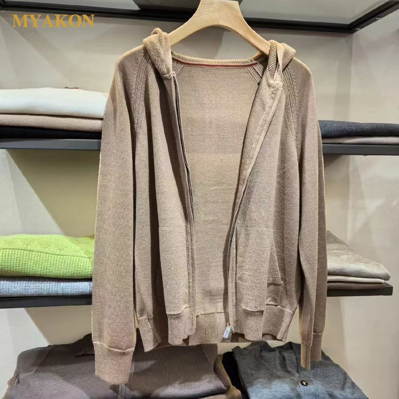 MYAKON Men's Casual Winter Coat 100% Cashmere Hooded Zipper Closure Flat Knitted Long Sleeve Sweater Quick Dry Breathable Thick