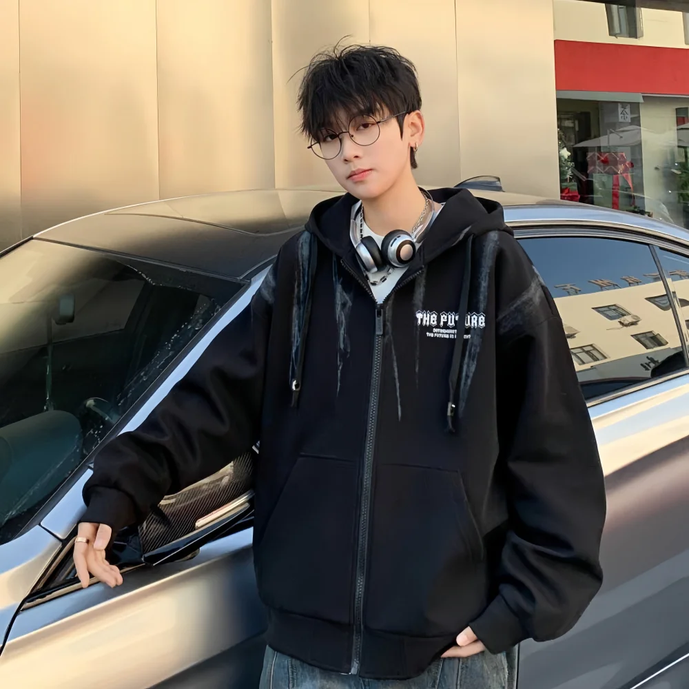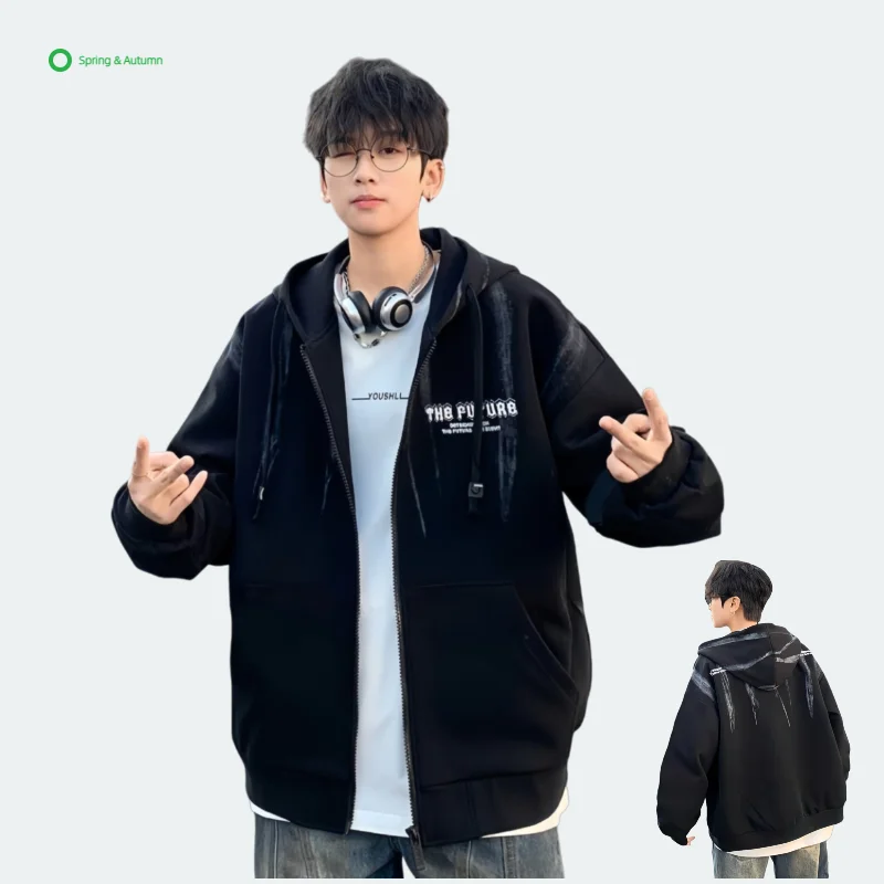 Polyester/Cotton Men's Spring Solid Knitted Loose Hoodie Custom Printed Full-Zip Puff Sleeve Breathable Windproof Quick Dry