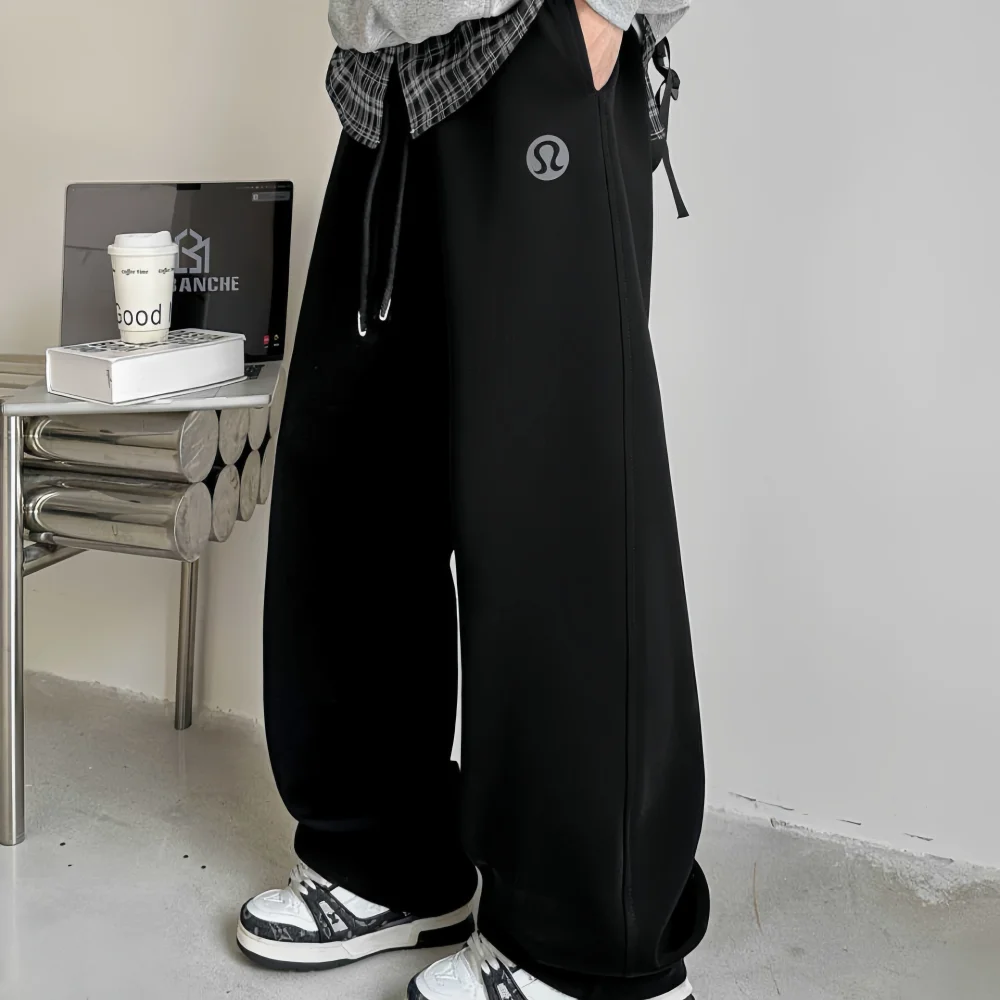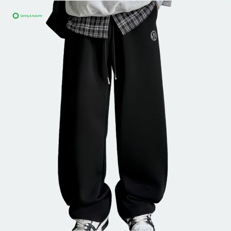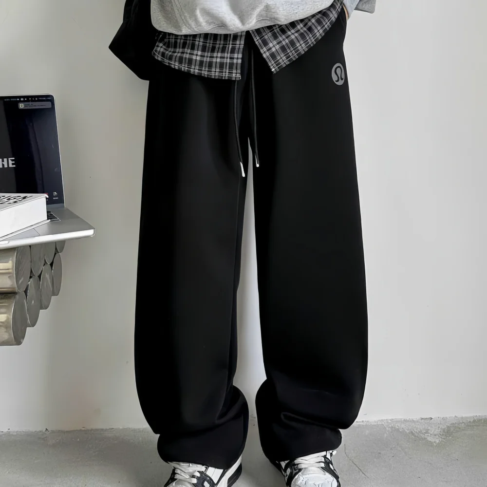 Men's Vintage Black Straight-Leg Plain Dyed Eco-Friendly Breathable Casual Loose Fashionable Solid Color Sweatpants Drawstring