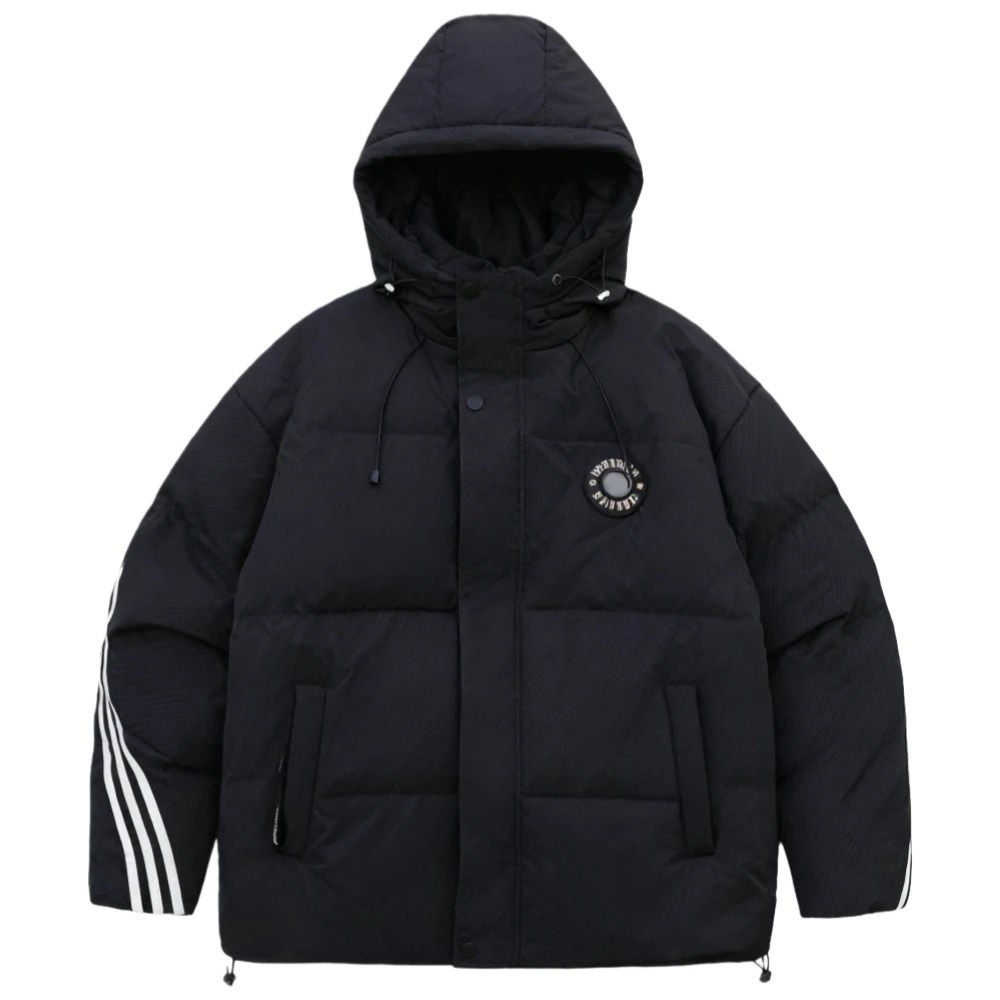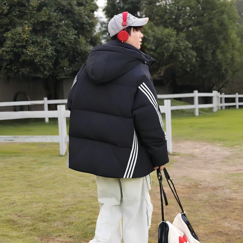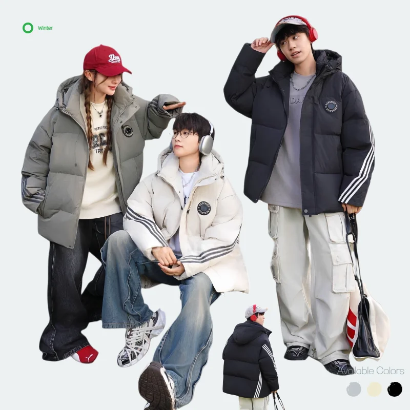 Custom Men's Winter Thick White 90% Polyester Waterproof Windproof Puffer Jacket Loose Fit 150g-200g Regular Sleeve Hood Zipper