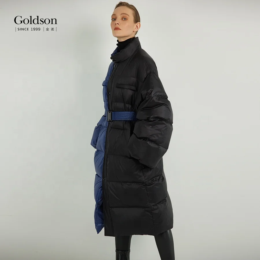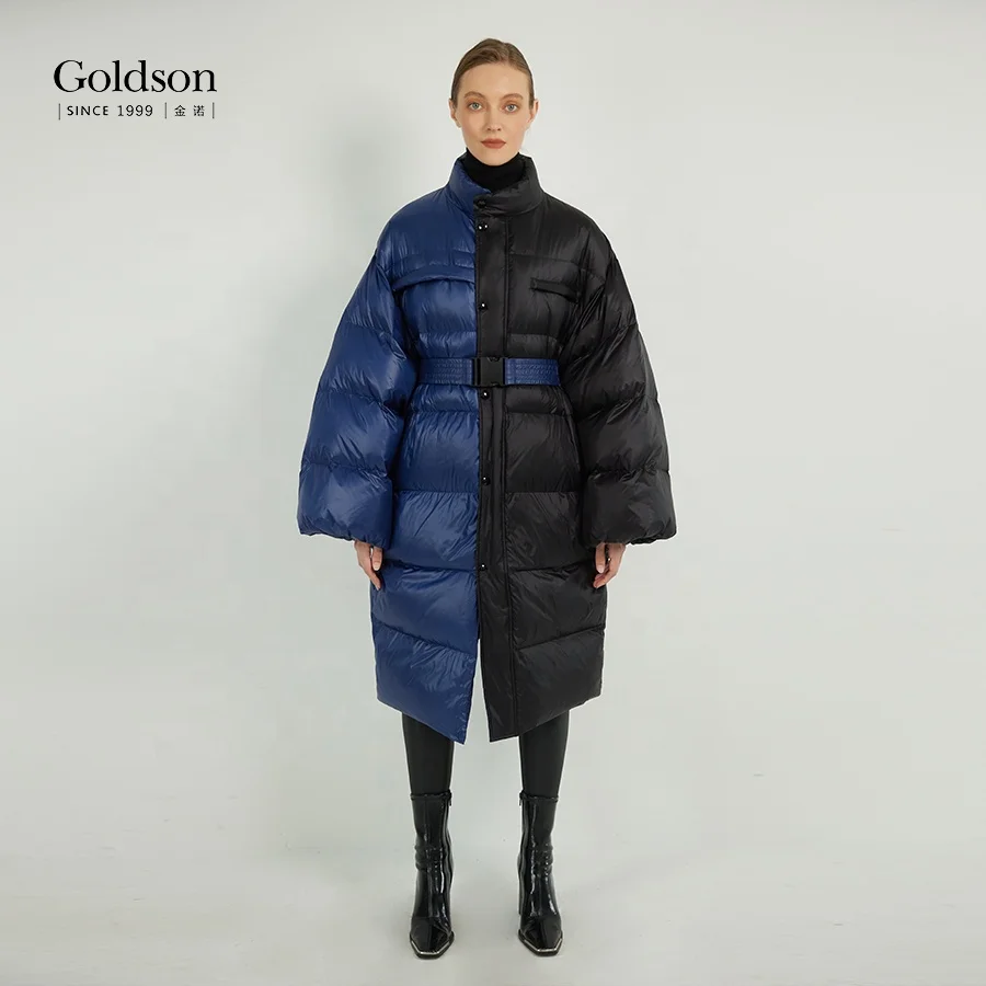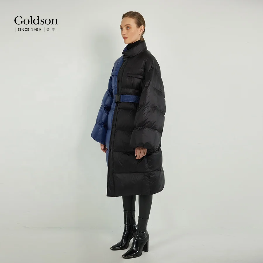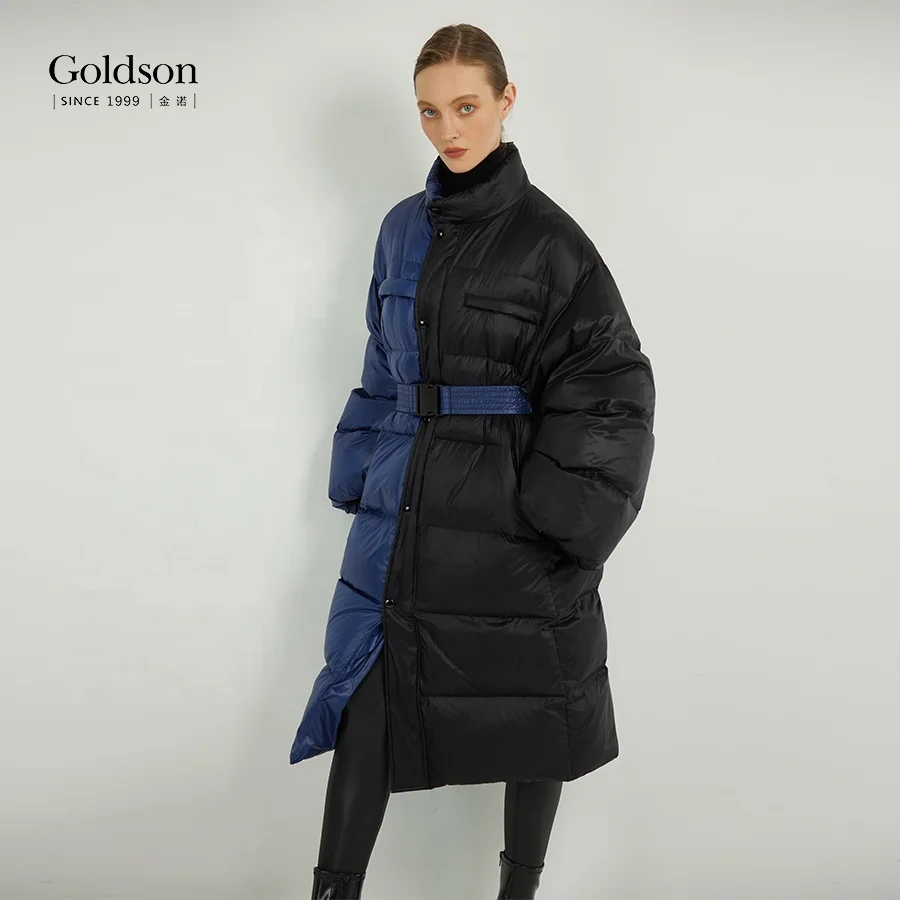 Women's New Design Sustainable Patchwork Contrast Color Puffer Jacket 90/10 Duck Long Winter Waterproof Stand Collar Nylon