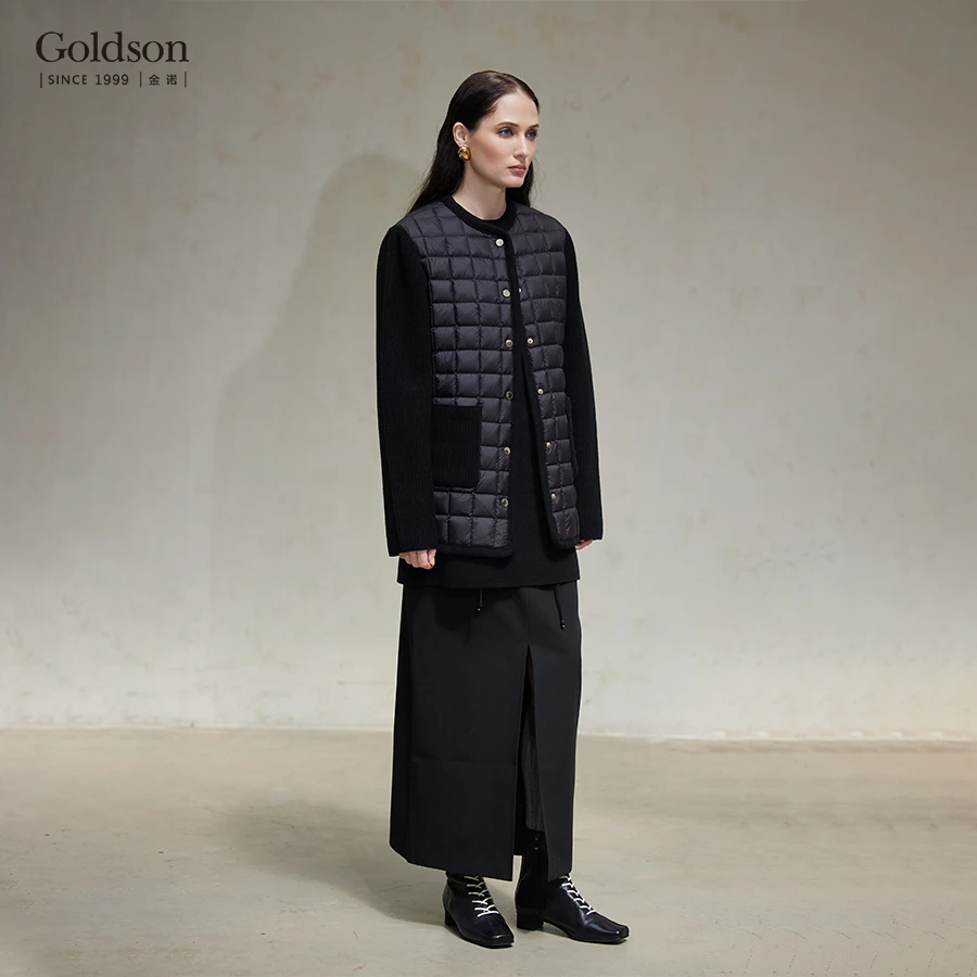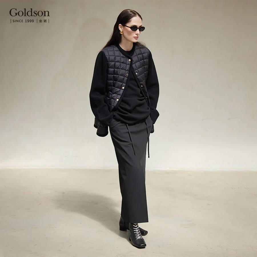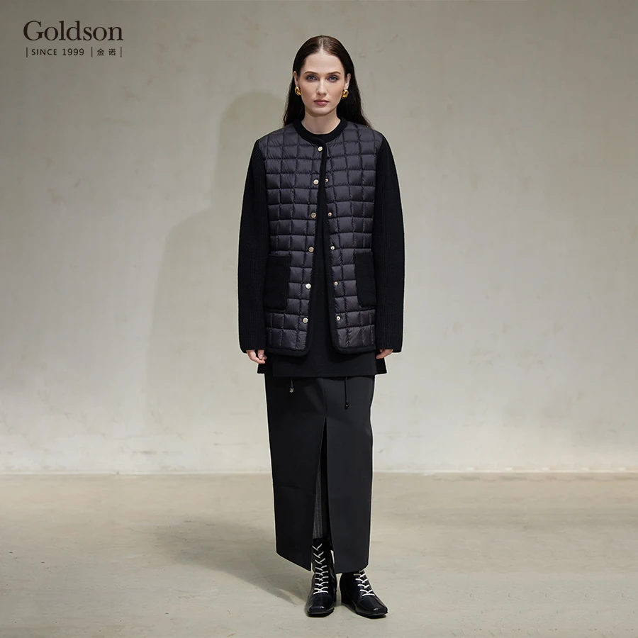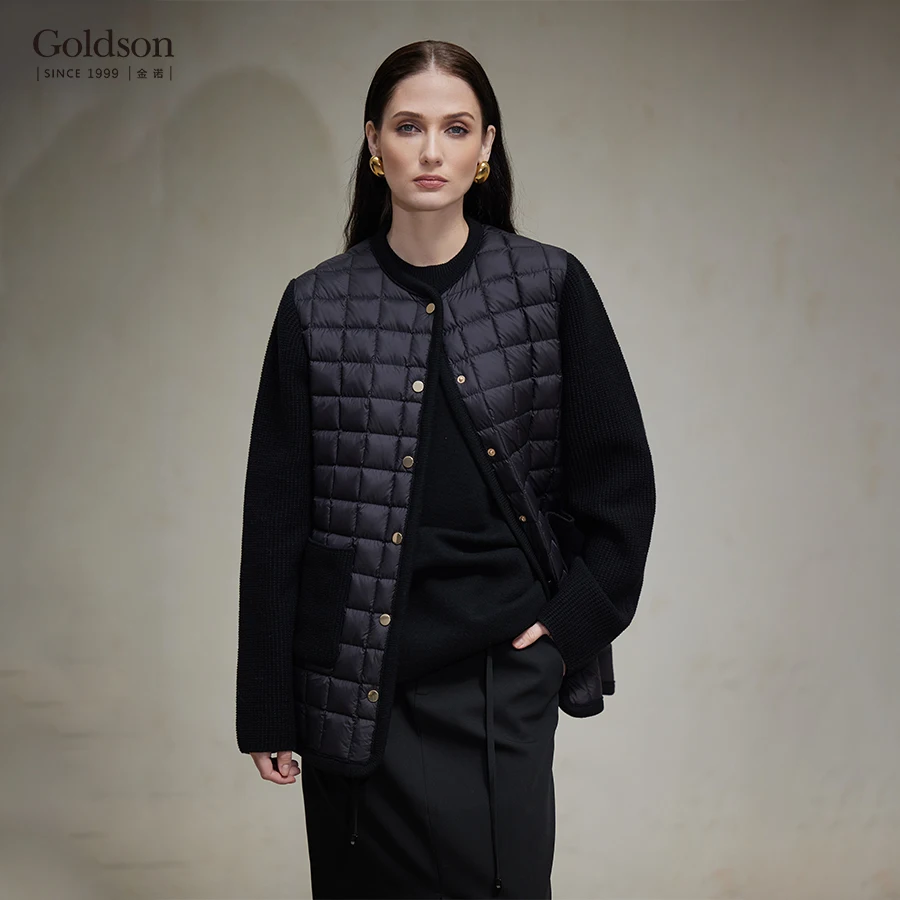 Women's Winter Thin Quilted Black Down Jacket with 95% White Duck Down Filling Checkered Pattern & Knit Spliced Sleeves
