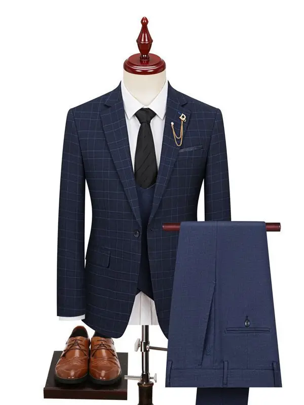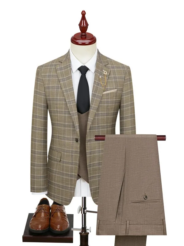 OEM & ODM Men's Korean-Style Plaid Slim-Fit Dress Suit Single Breasted Formal Wear for Grooms