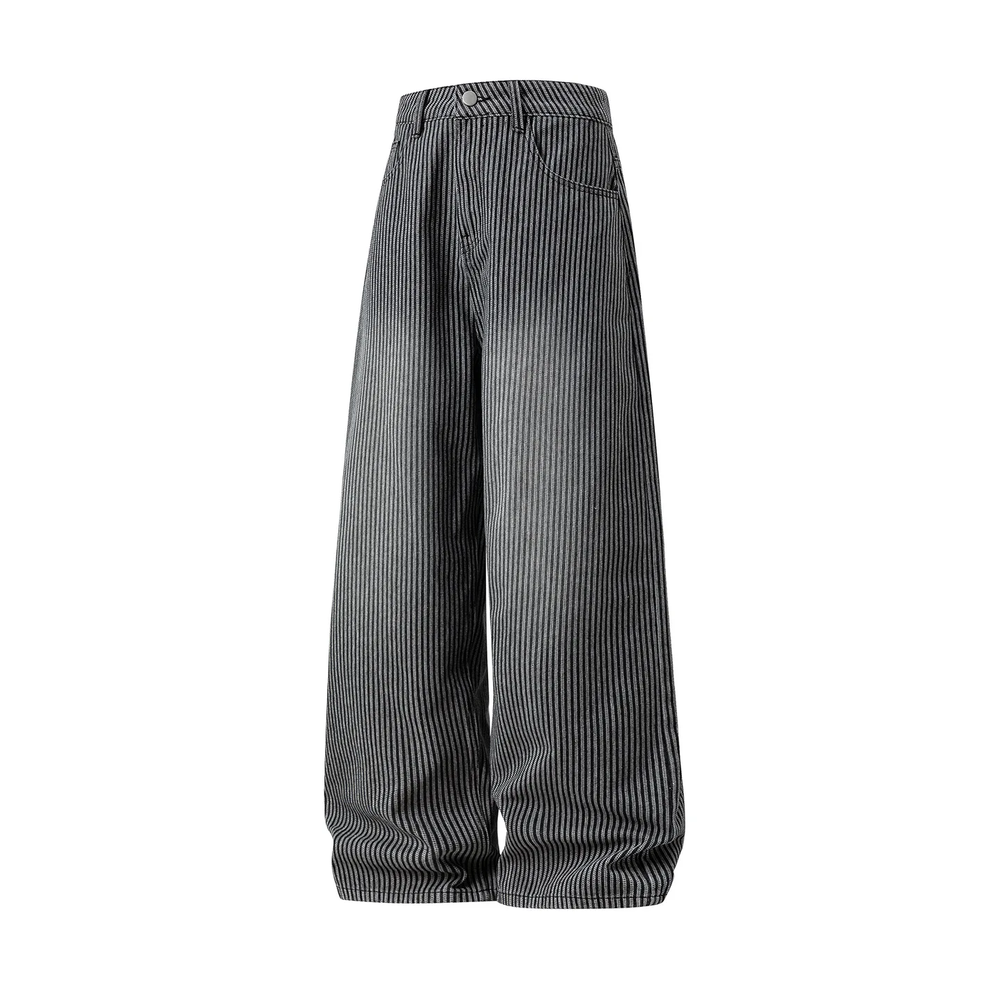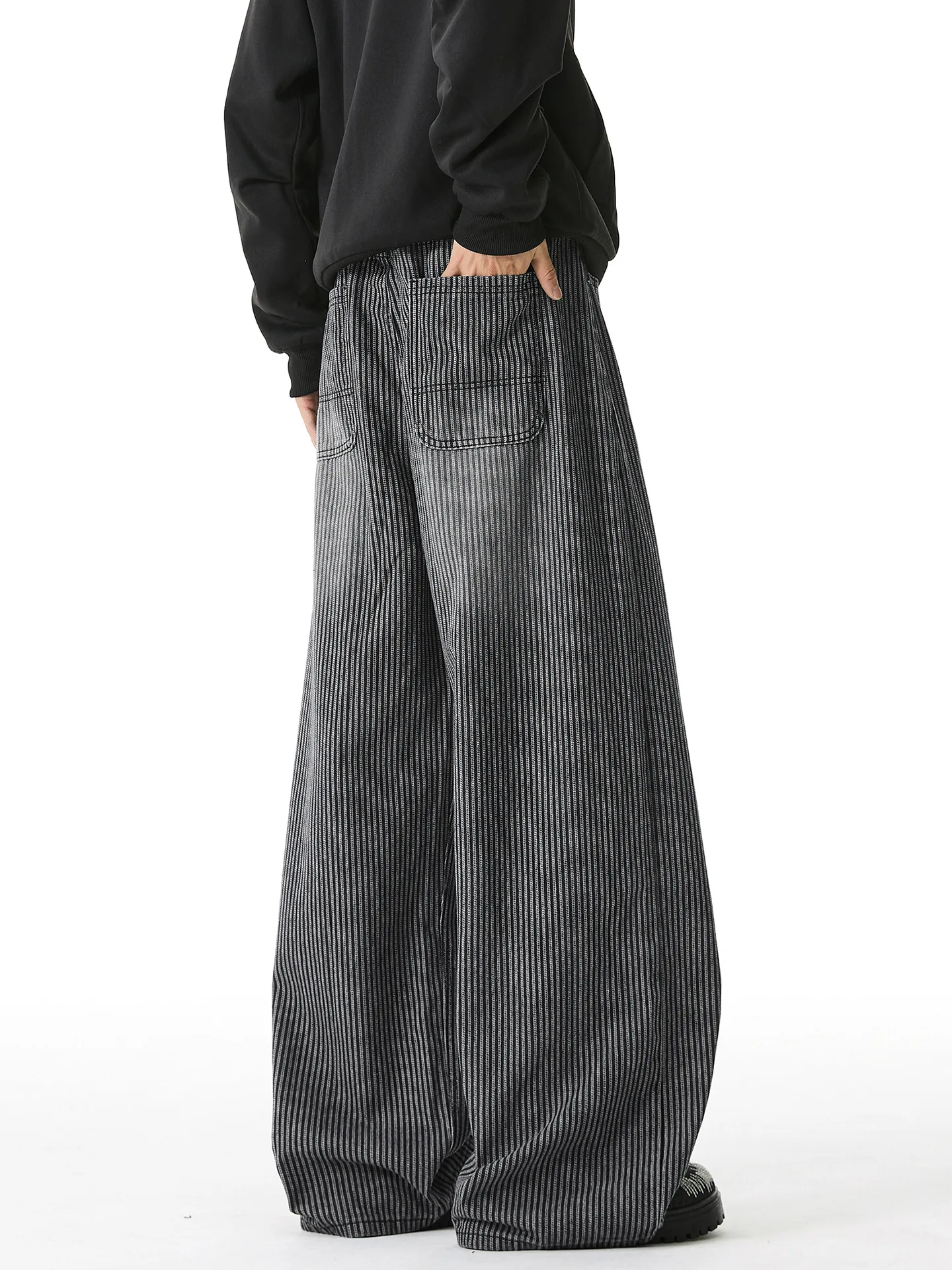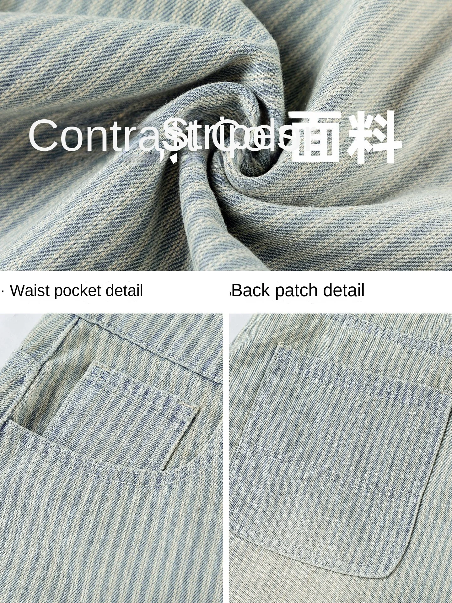 Vintage American Style Men's 100% Cotton Loose Straight Pants Autumn Long Pants Mid Casual Vintage Vertical Stripe Washed Jeans