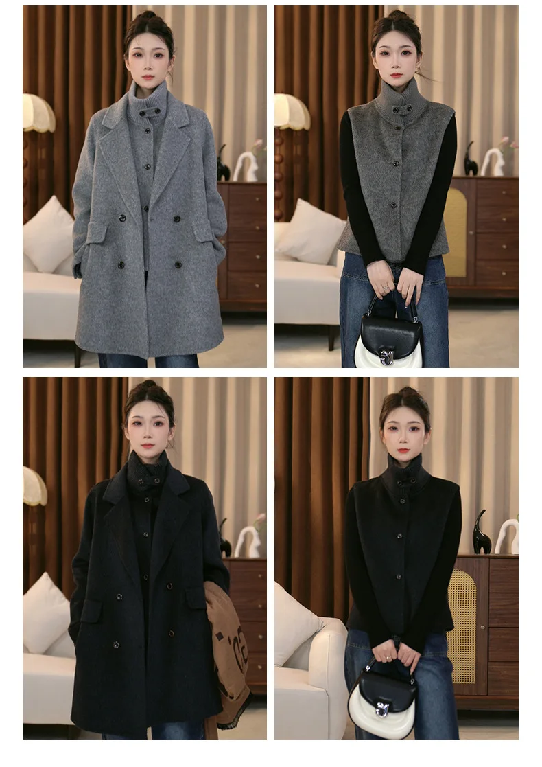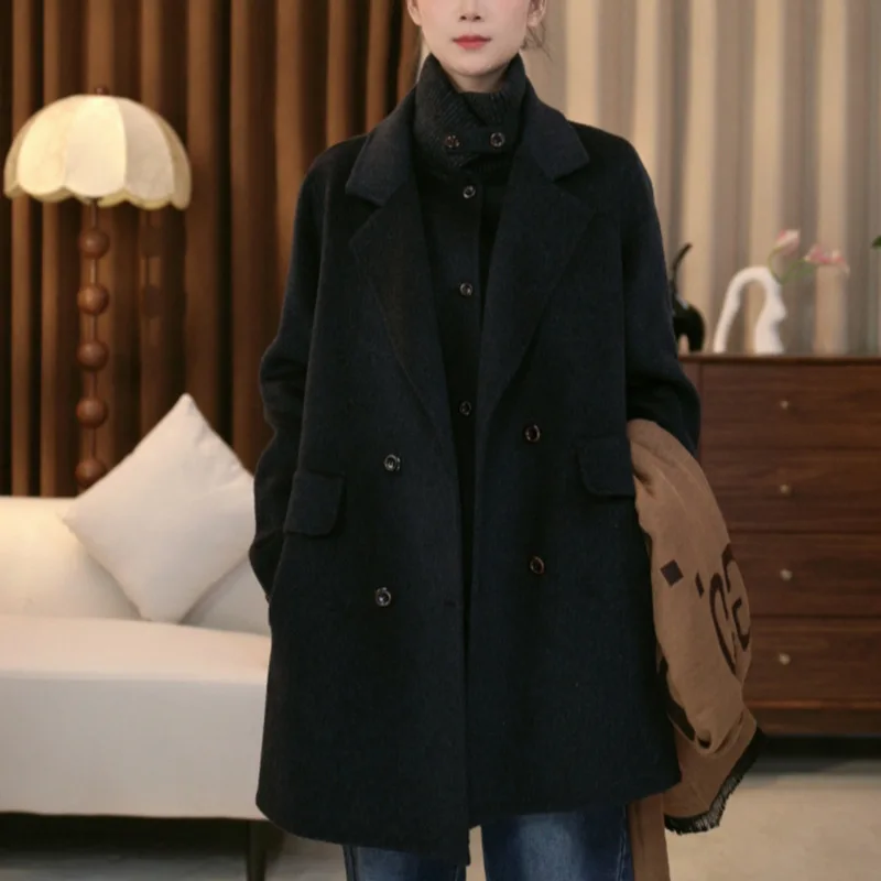 OEM ODM Women's Elegant Korean Style Double-Sided Cashmere Woolen Stand Breathable Winter Jacket Button Decoration Long Length