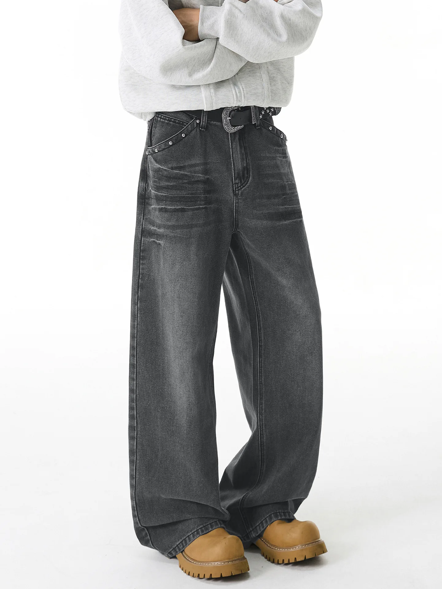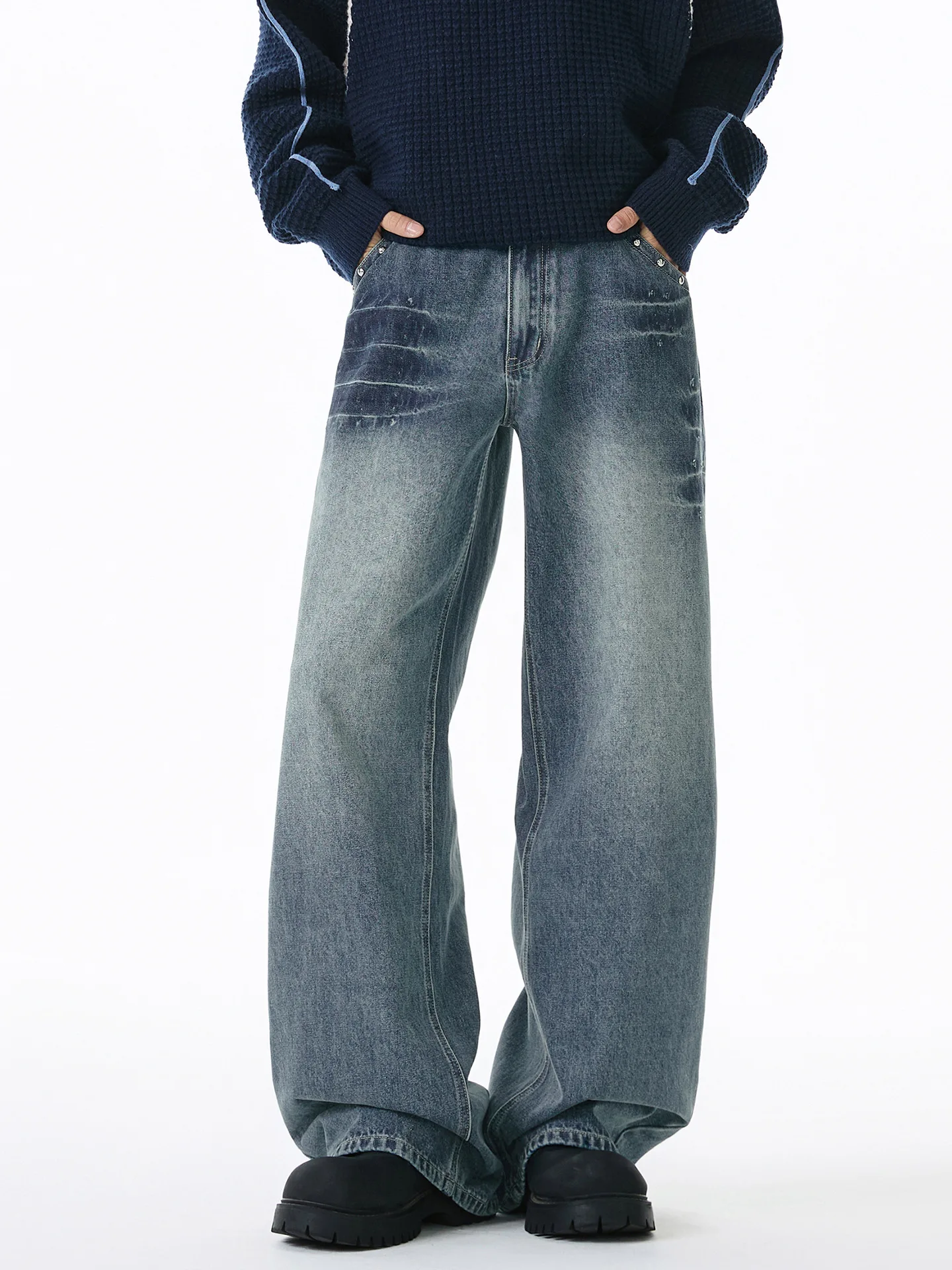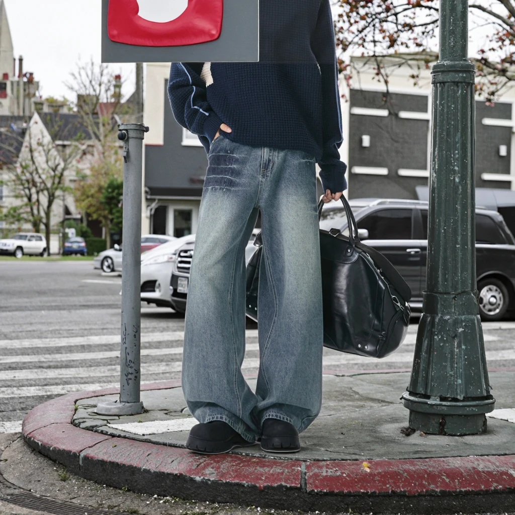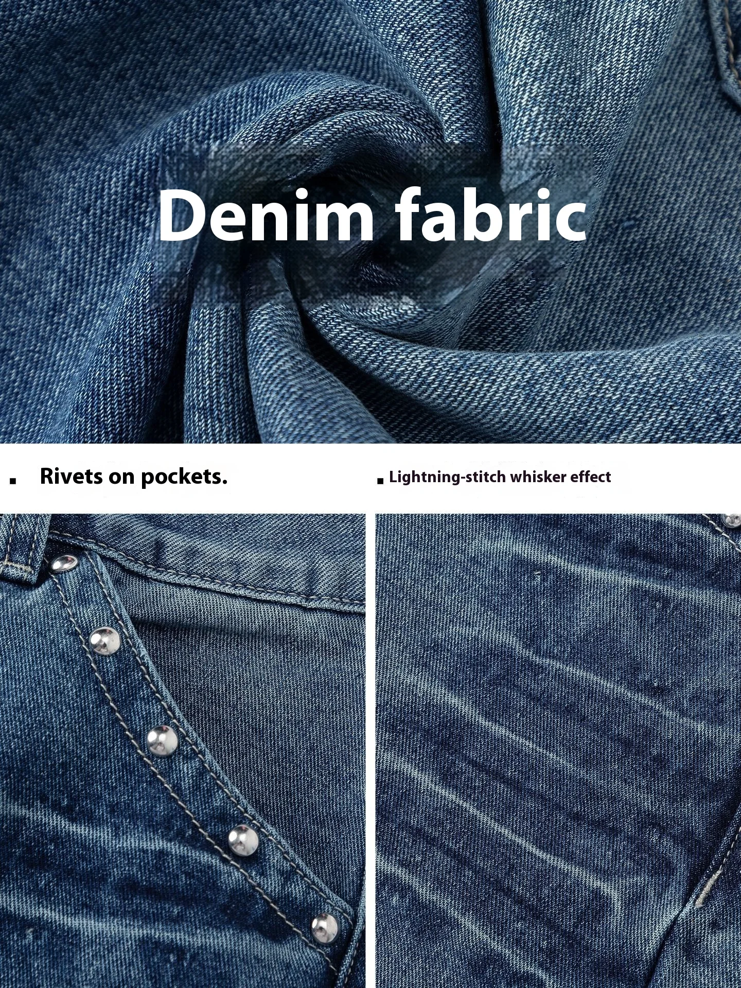 Autumn Men's Casual Denim Button Lightning Cat Whisker Textured Washed Breathable Fleece Jeans-Vintage American Straight Pants