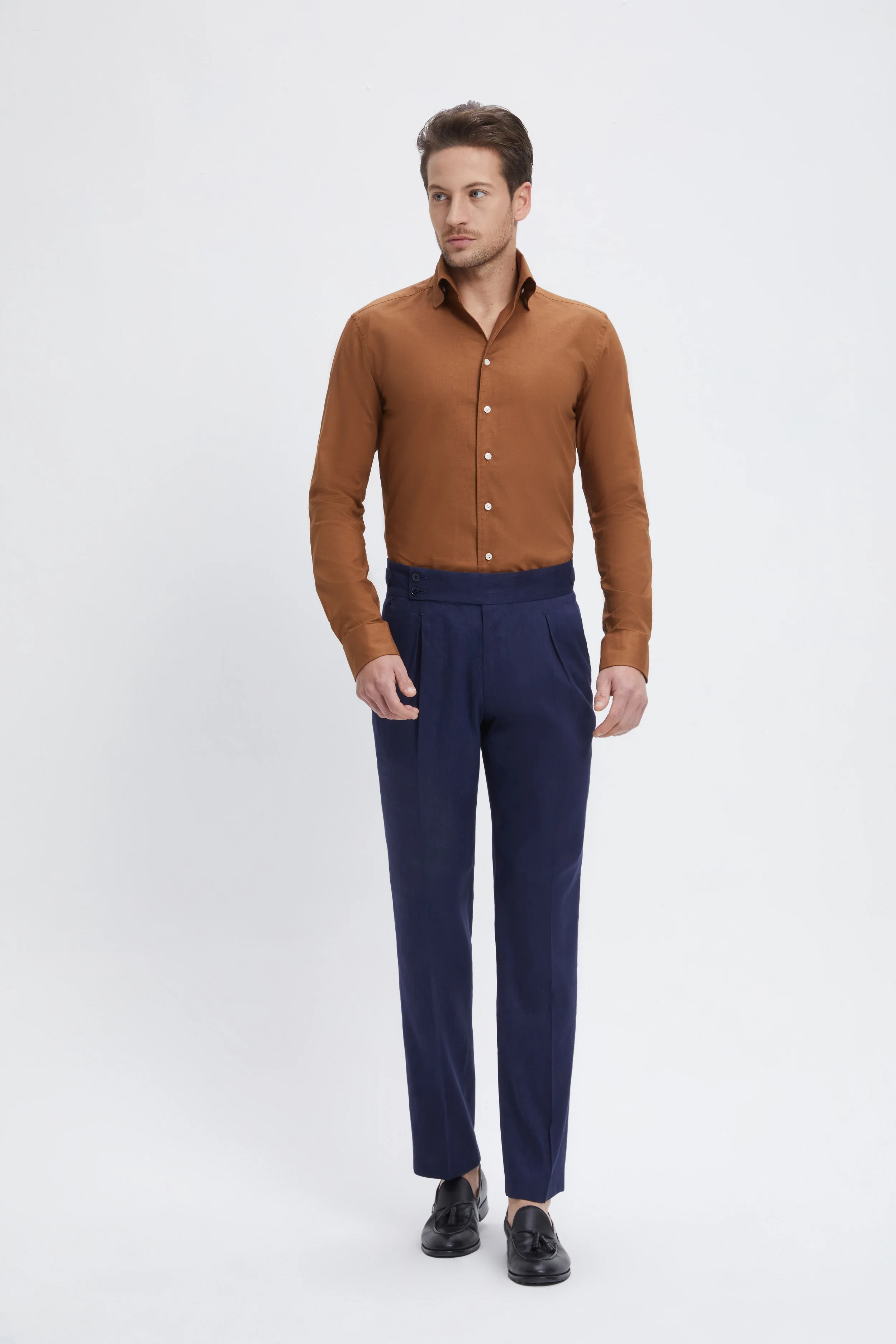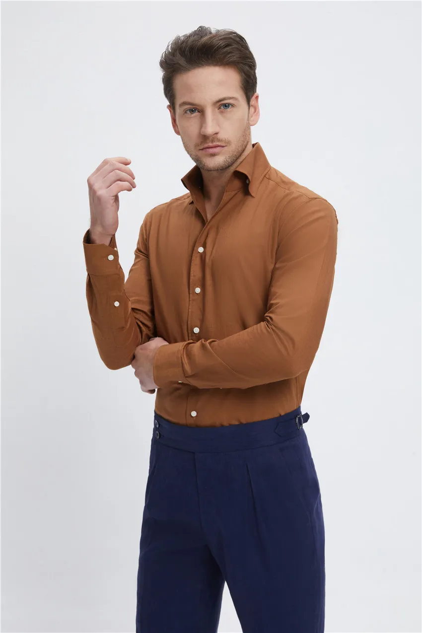Custom Made Bespoke MTM Factory Price High Quality Casual Vintage Retro Style Cotton Linen Brown Slim Men Shirts