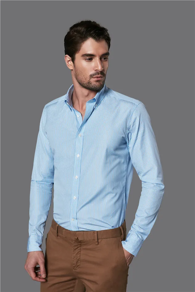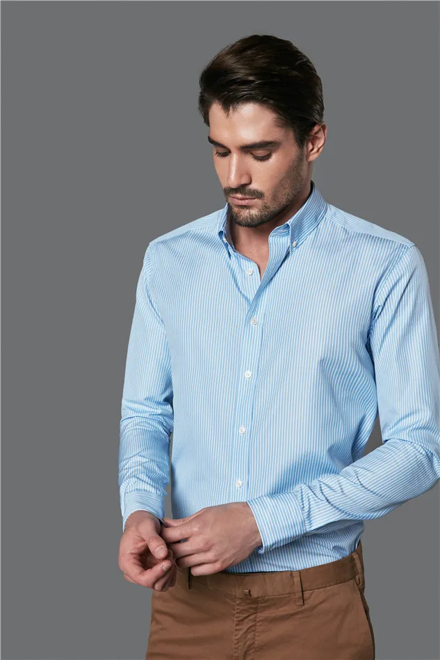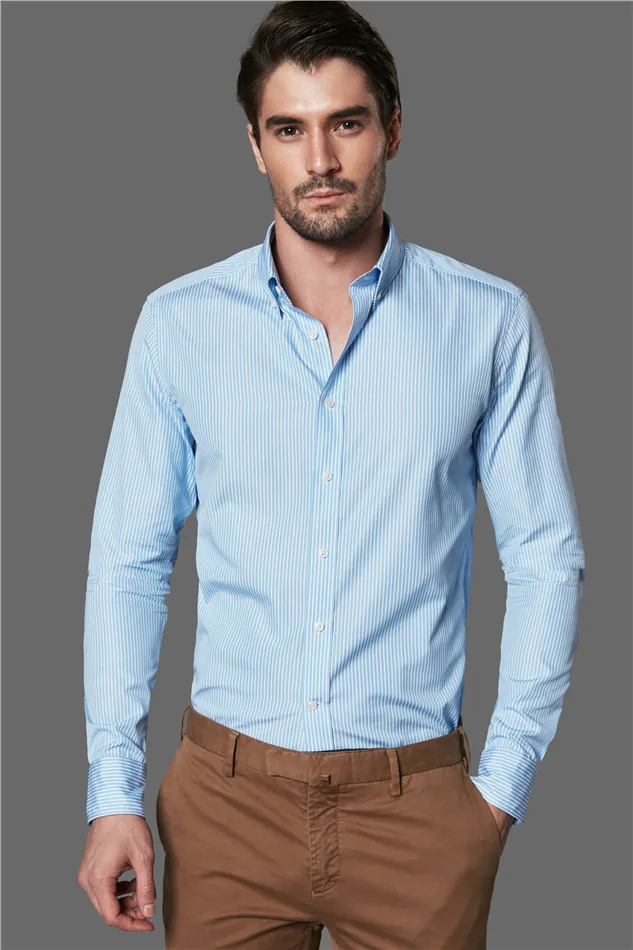 New Style Casual Custom Print Logo 100% Cotton Blue White Stripes Long Sleeve Men Shirt