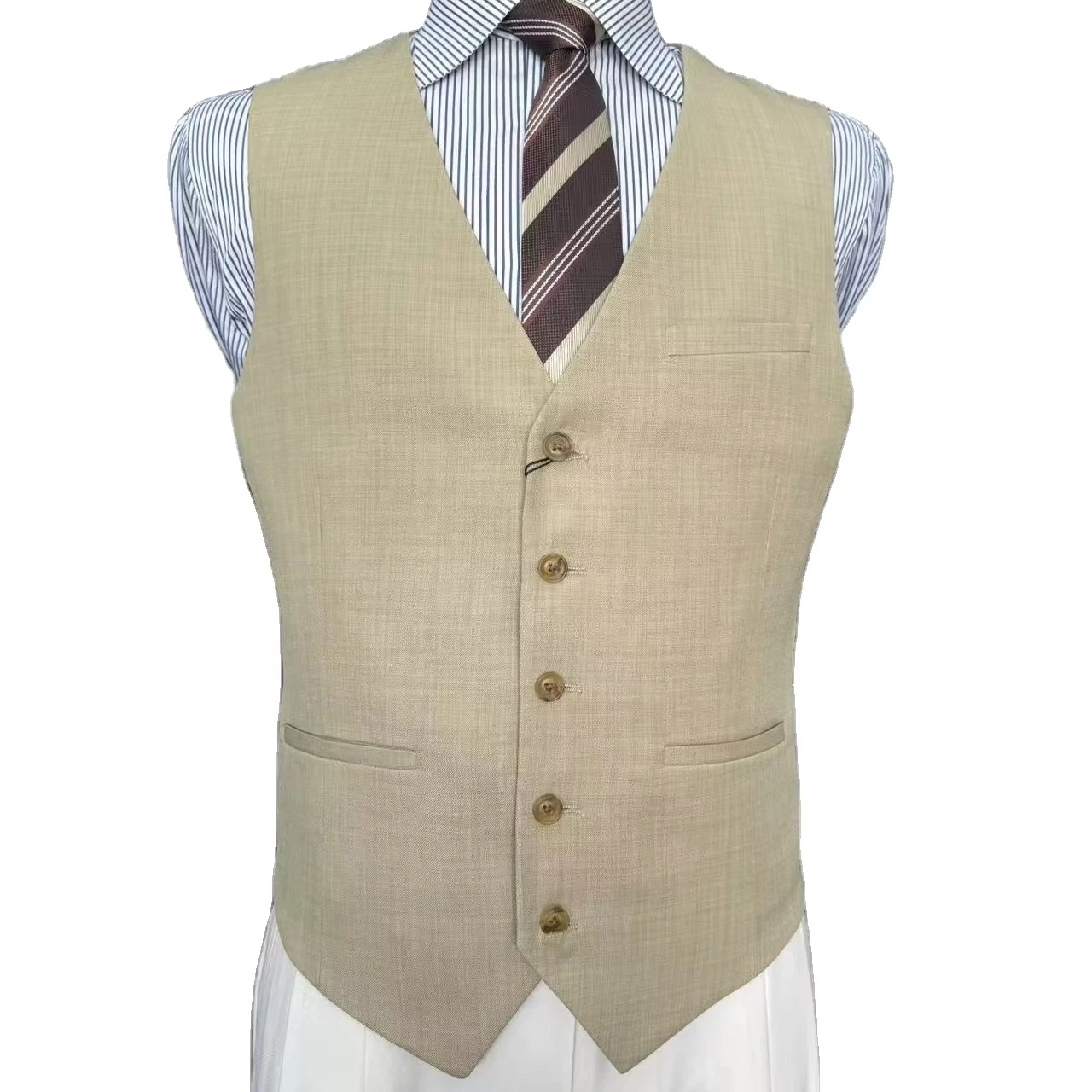 MTM OEM Elegant Classic Woolen Beige Fabric V-Neck Waistcoat Breathable Formal Short Suit for Wedding Parties Man's Vest