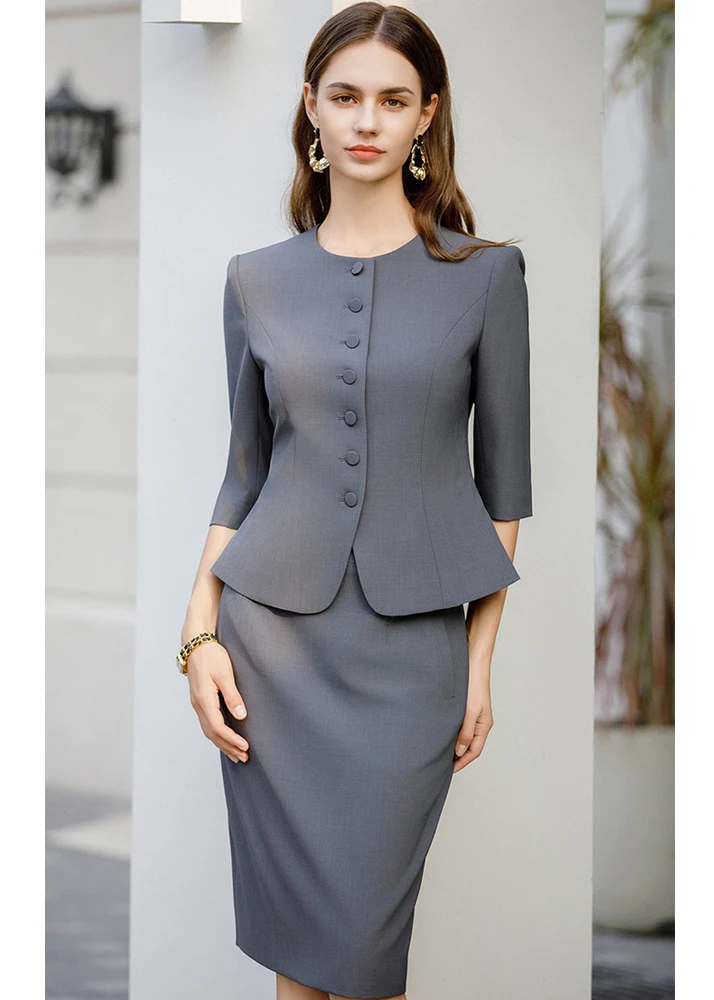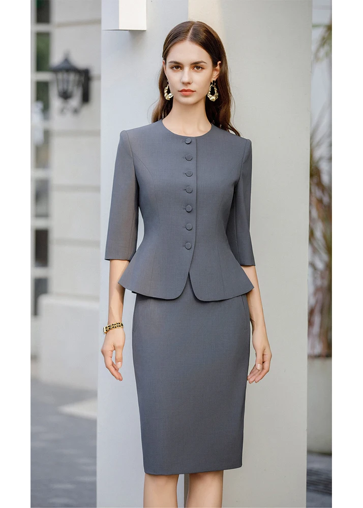 2-Piece High-End Summer Collection Customizable Mid-Sleeved Grey Fitted Western Dress Set Formal Style Blazer Tops Knee Skinny