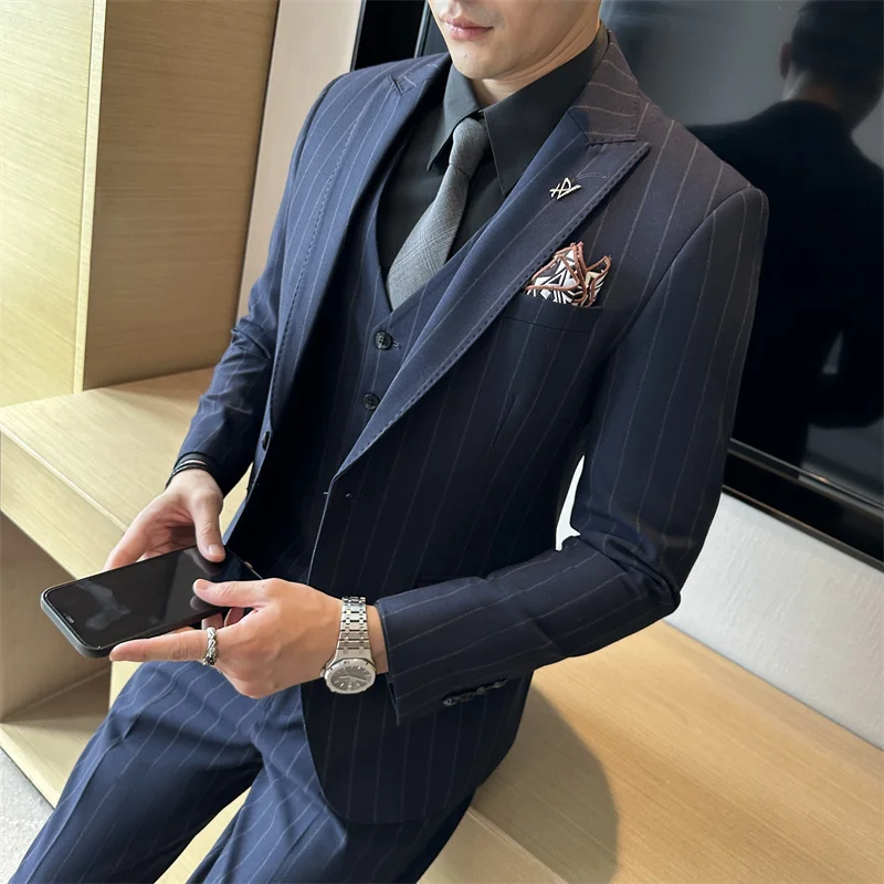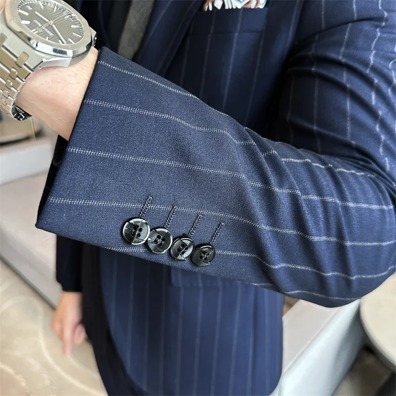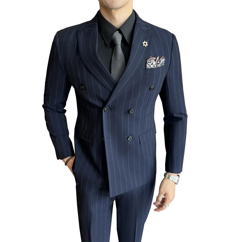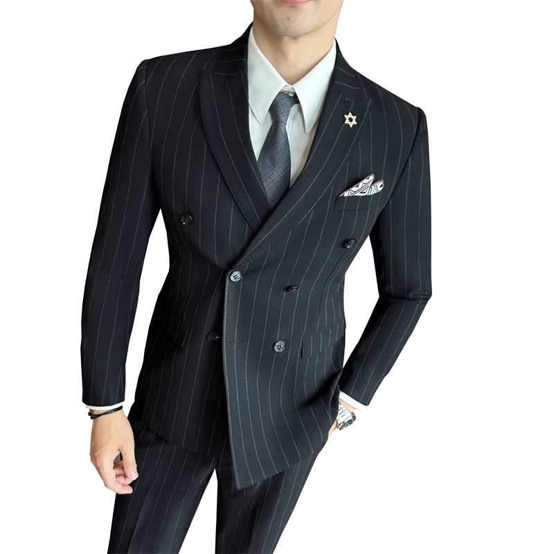 Men's Double-Breasted Striped Slim Suit Professional Business Formal Wear Work Wedding Interviews Flat Front Zipper Fly Worsted