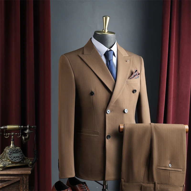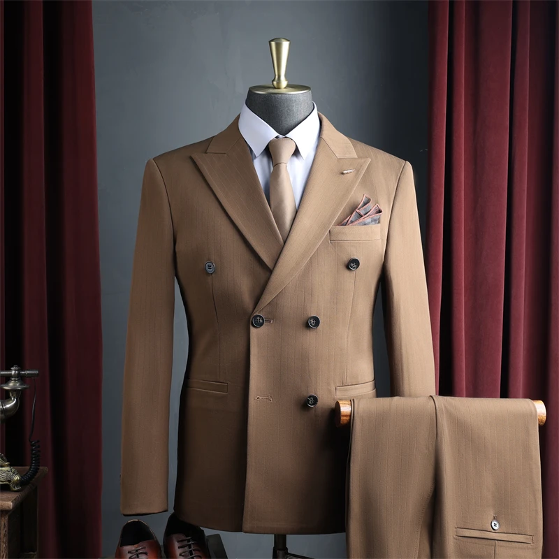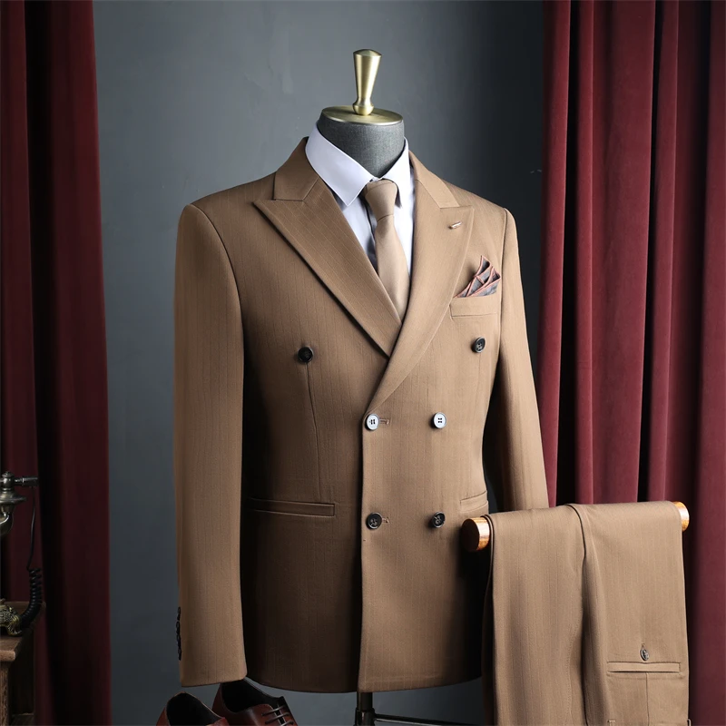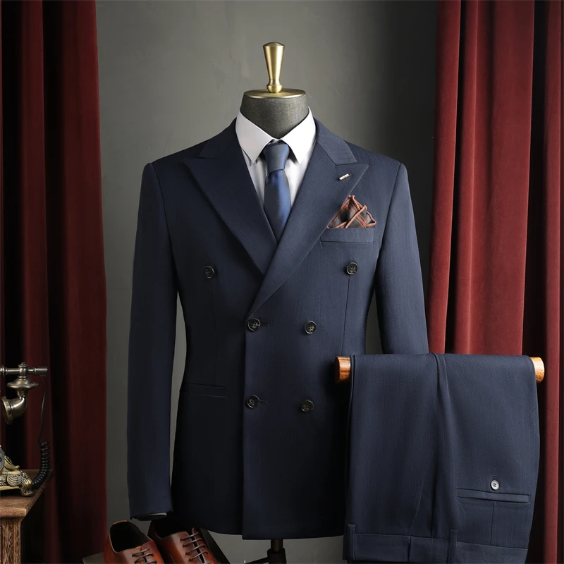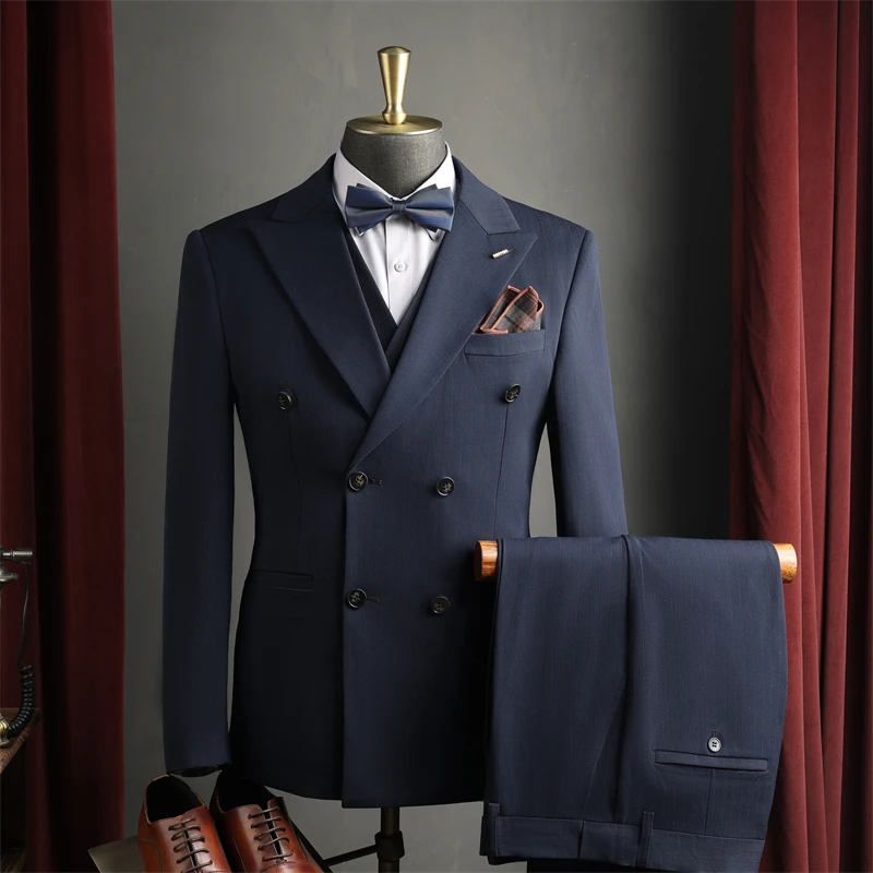 Men's Double-Breasted Breathable Business Wedding Suits 3-Piece Set Anti-Wrinkle Worsted Fabric for Office Evening Wear Luxury