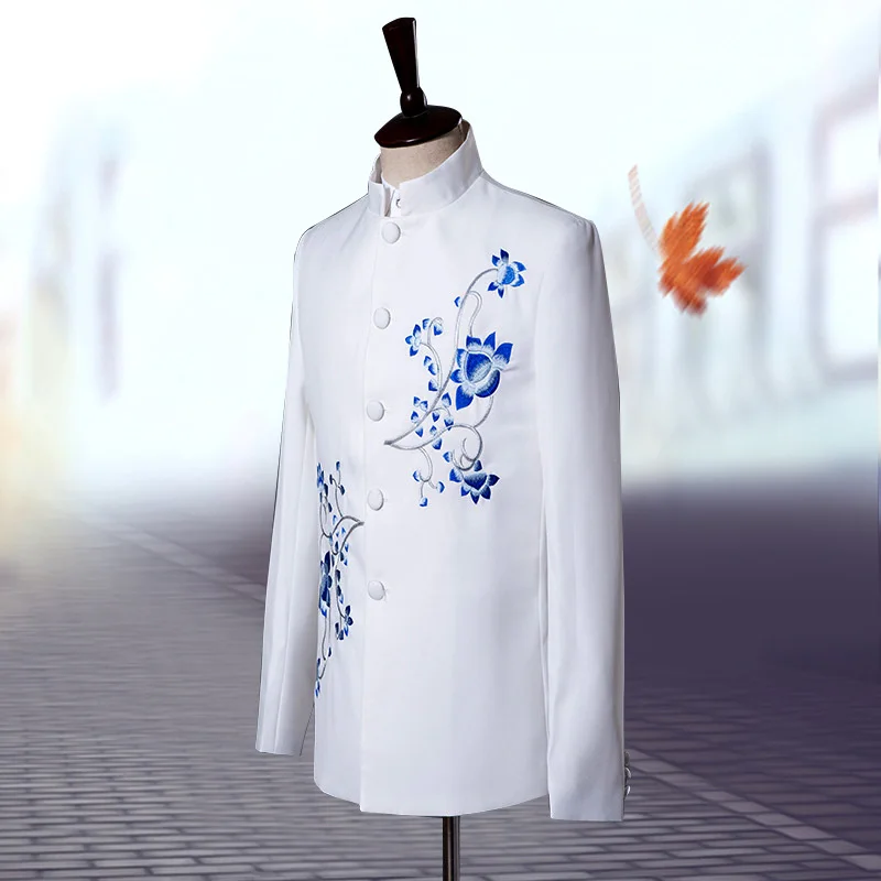 Men's Suit Set Embroidery Choir Casual Zhongshan Suit Blue and White Porcelain Host Stage Performance Clothes