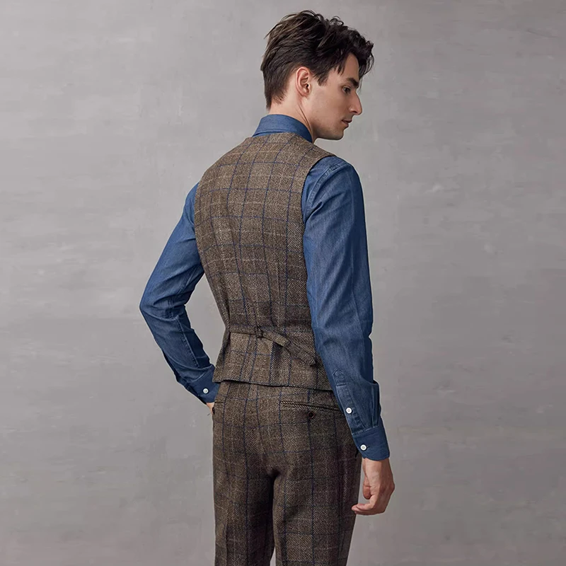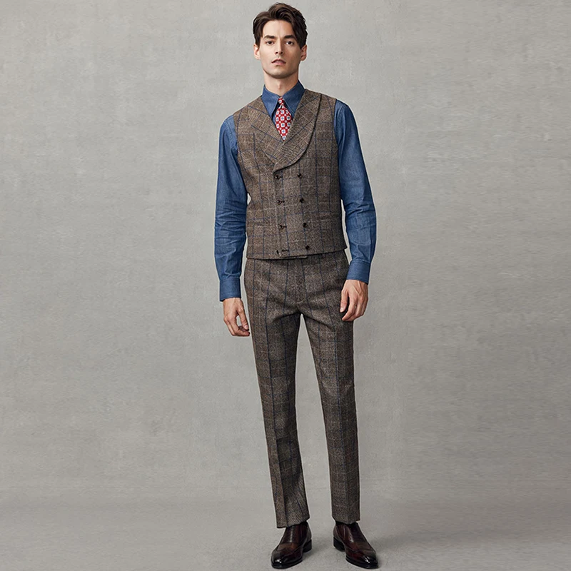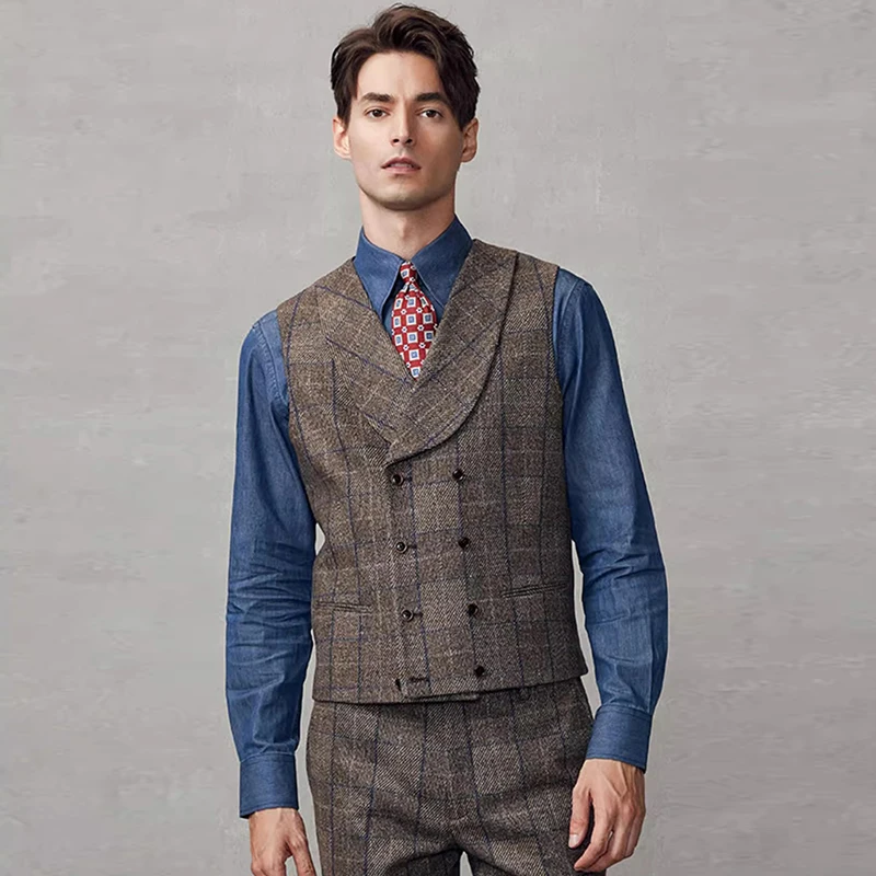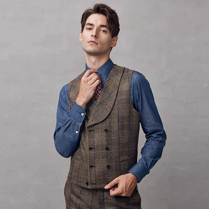 Brown Tweed Vintage Double-Breasted Jacket for Men Exquisite Business Wedding Attire Breathable Undershirt Gentleman Casual