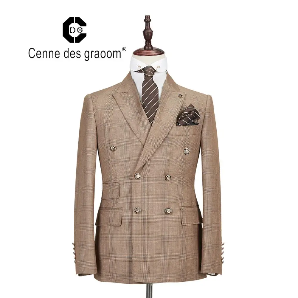 Mens Suit 2 Piece Slim Fit Brown Wedding Office Double Breasted for Cenne Des Graoom Lapel Blazer Trousers