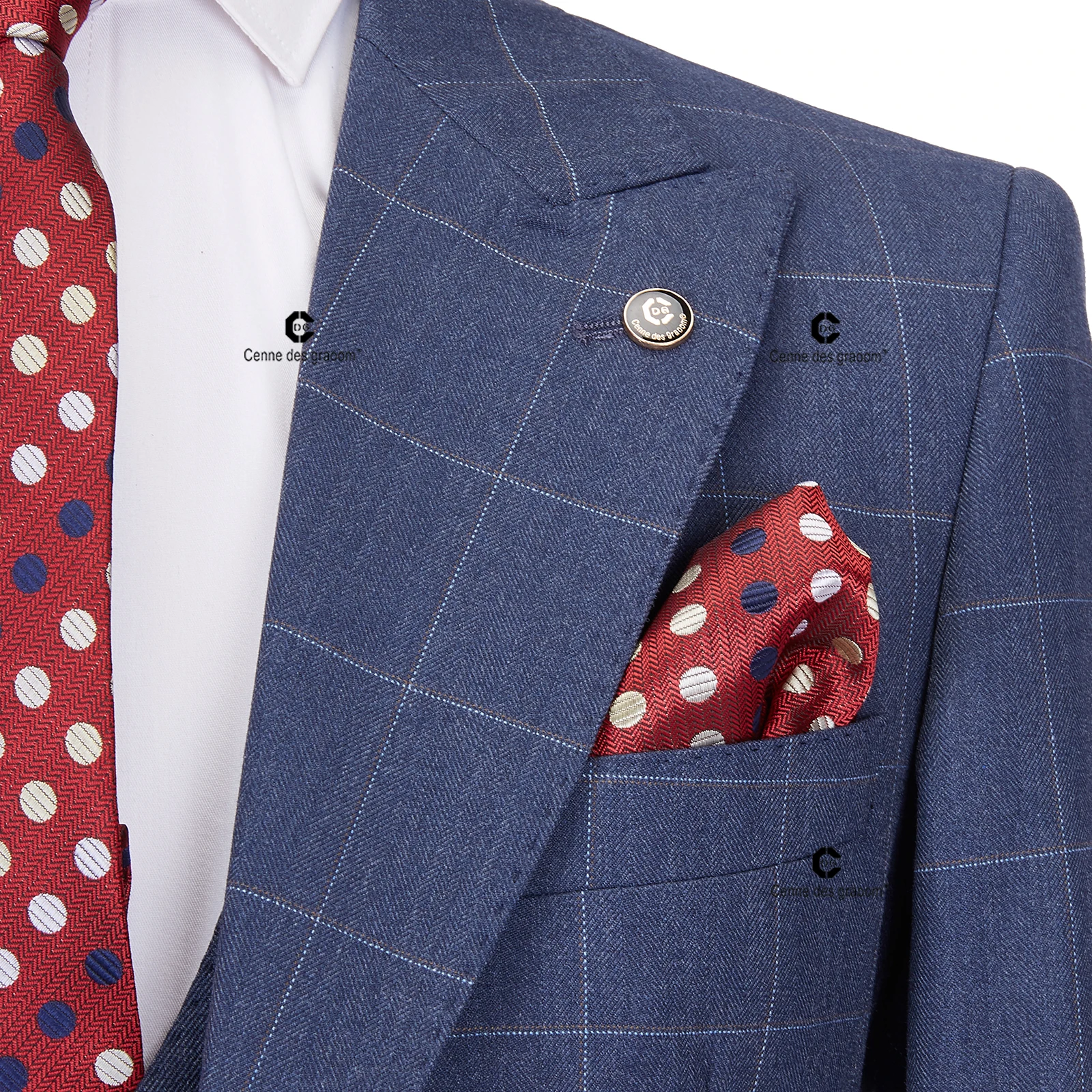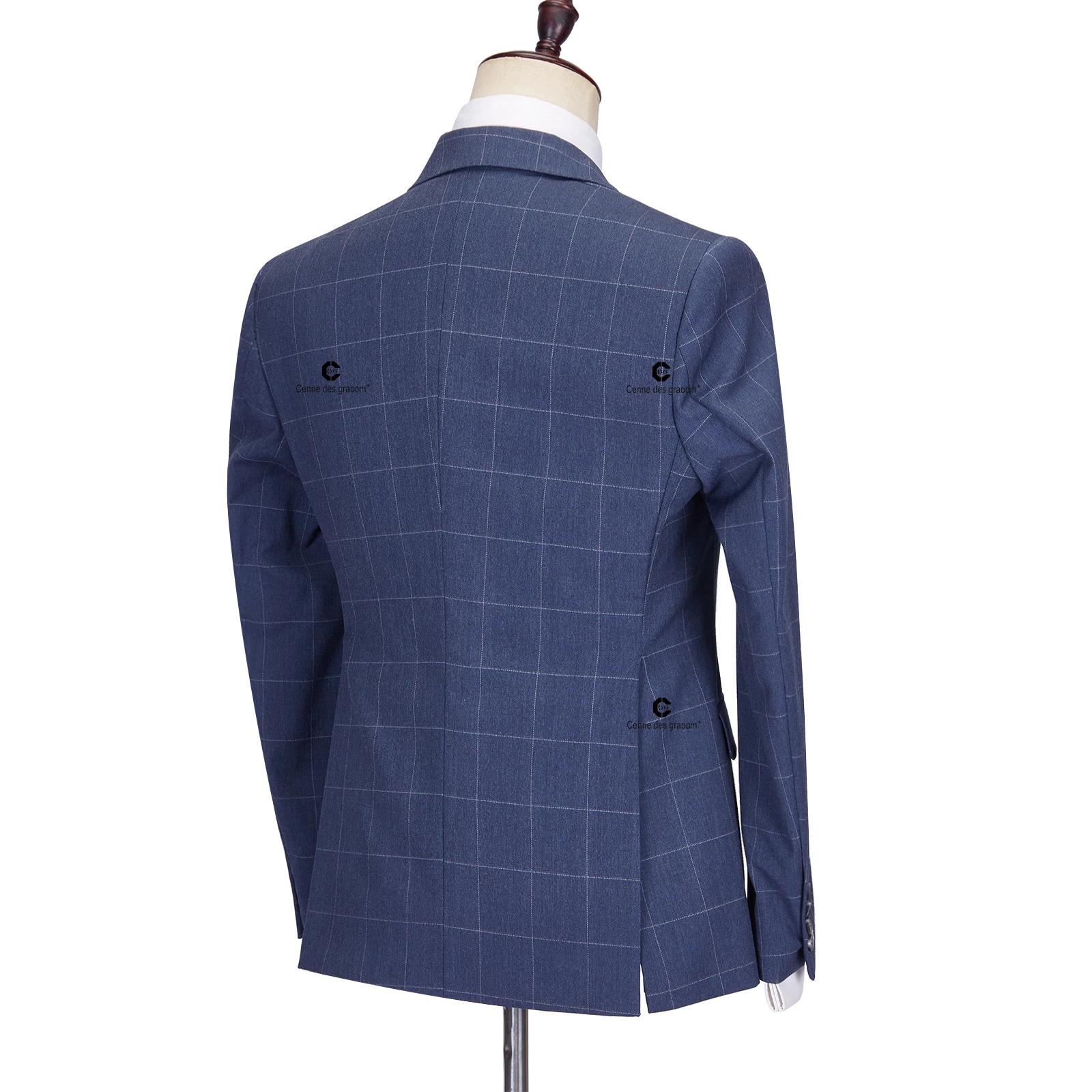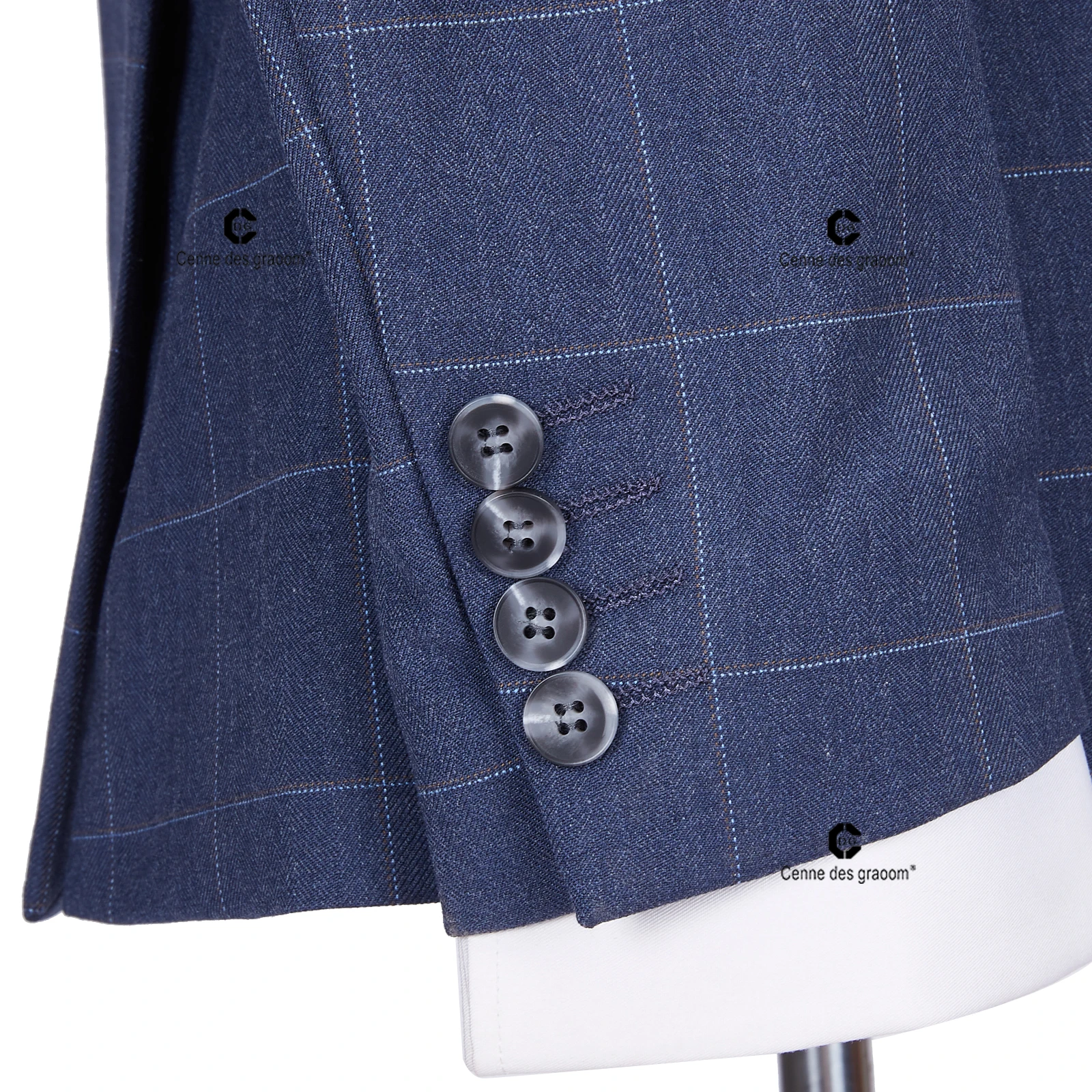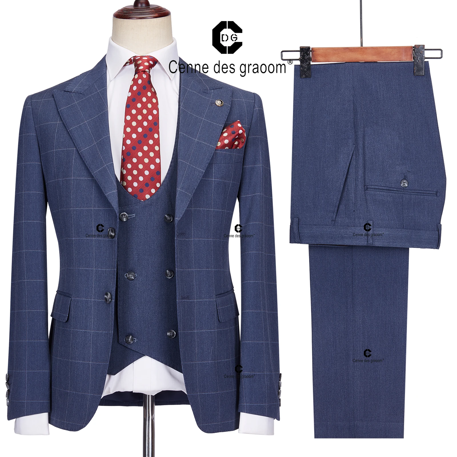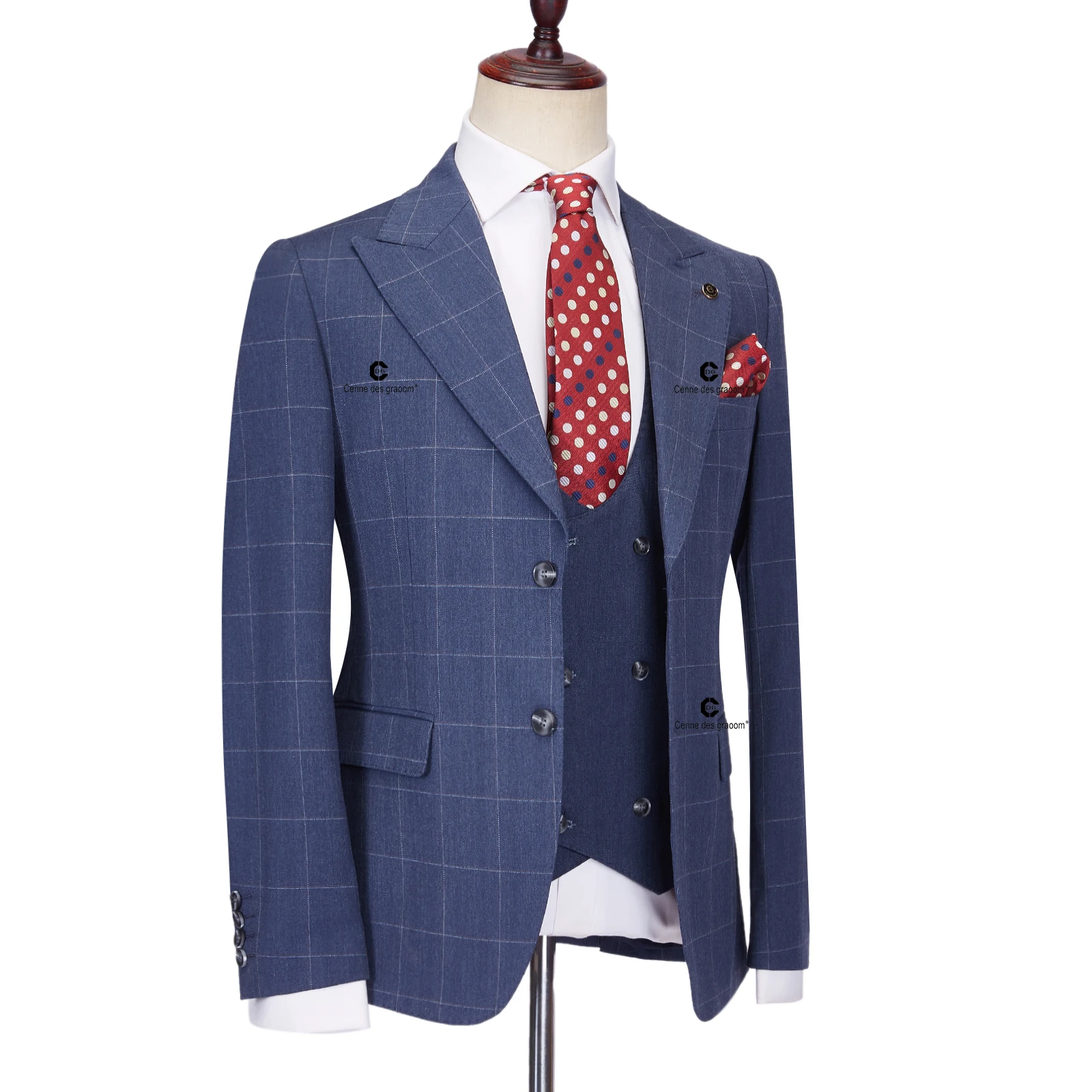 Cenne Des Graoom 2023 Tailor-Made Blue Plaid Men Suits Slim Fit Jacket Vest Pants 3 Pcs Set Groom Business Office Meeting Party