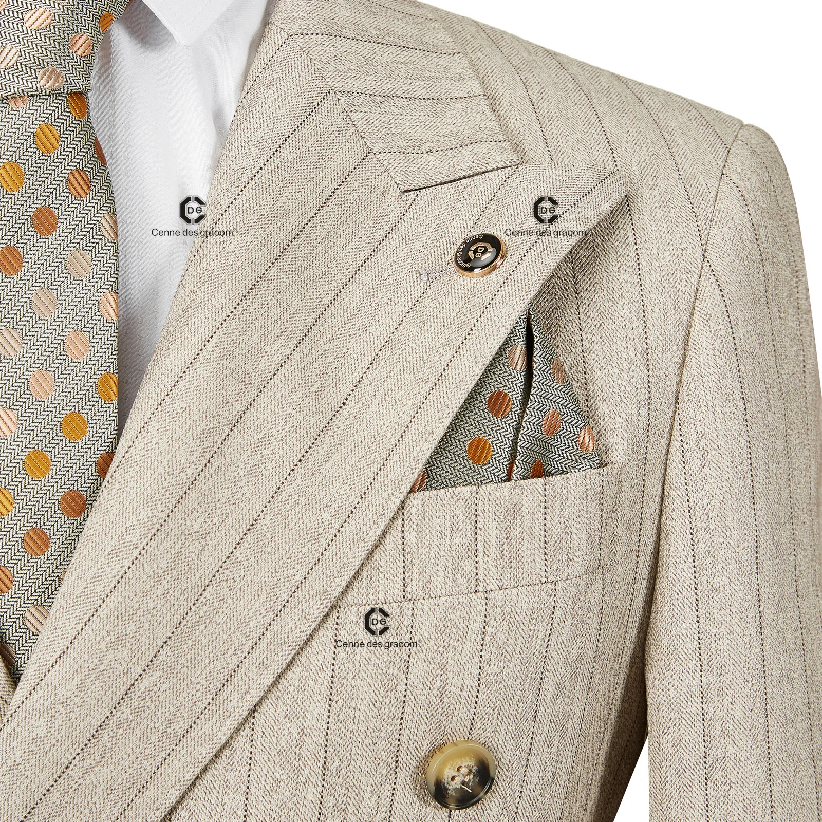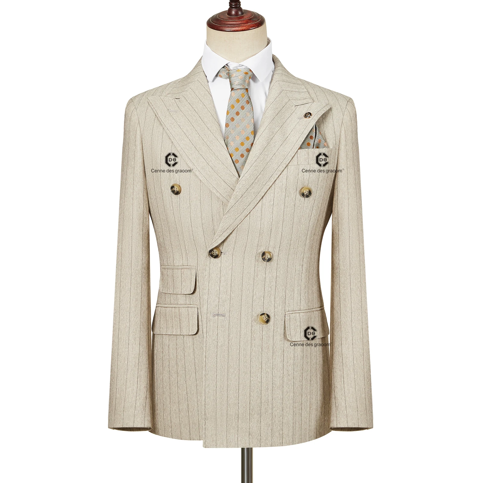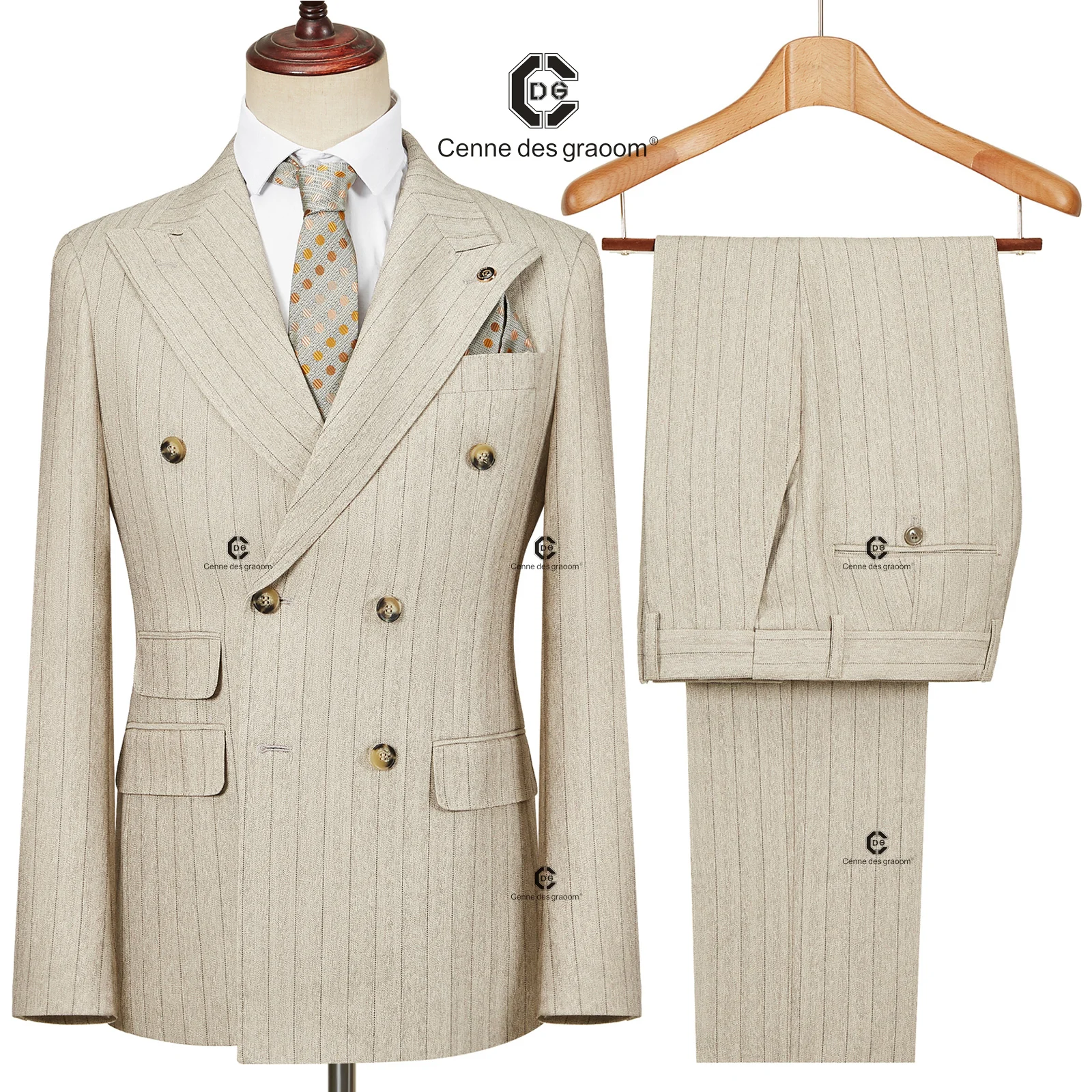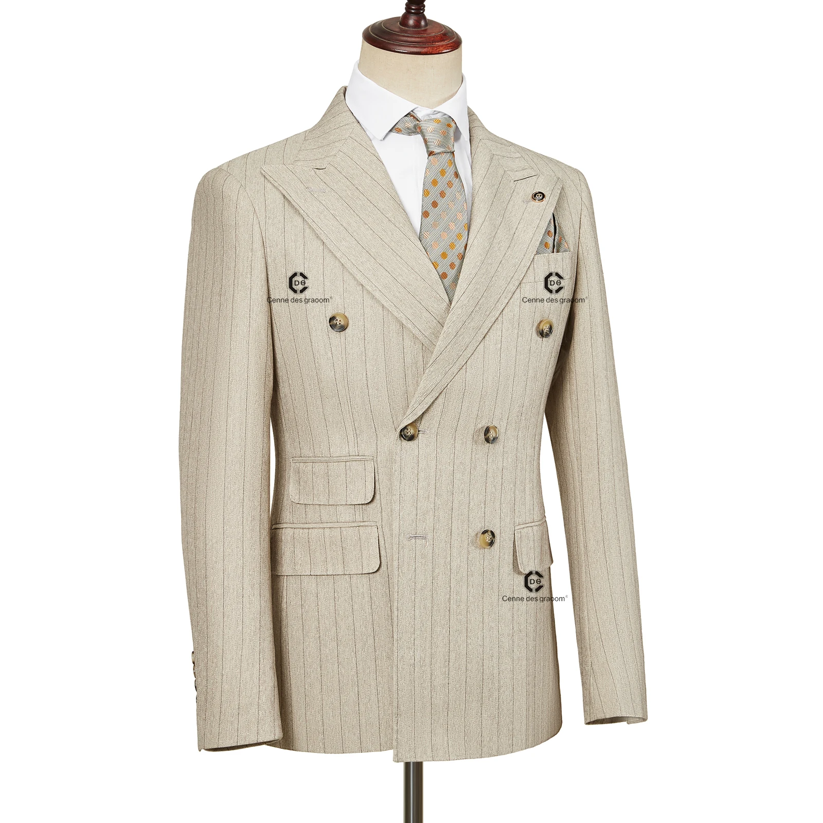 Cenne Des Graoom 2026 Double-Breasted Khaki Stripe Suits for Men Tailor-Made 2 Piece Set Jacket Pants Business Meeting Wedding