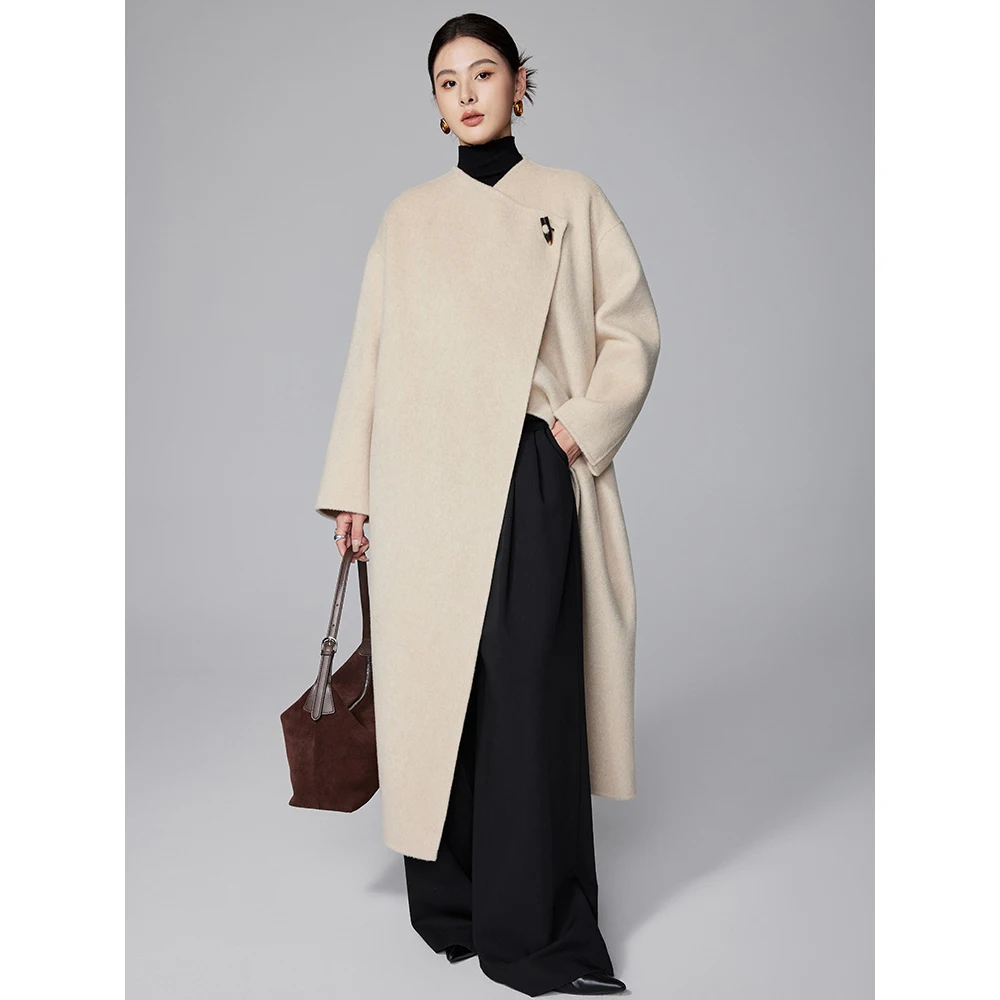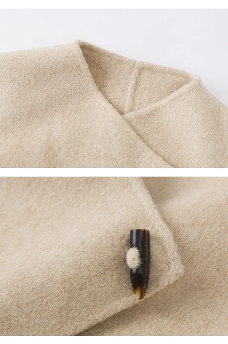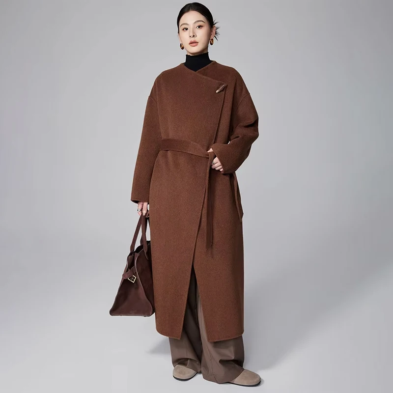 Autumn and Winter Long One Button Wool Overcoat for Women Women's Cow Horn Buckle Tied Double-sided Cashmere Coat