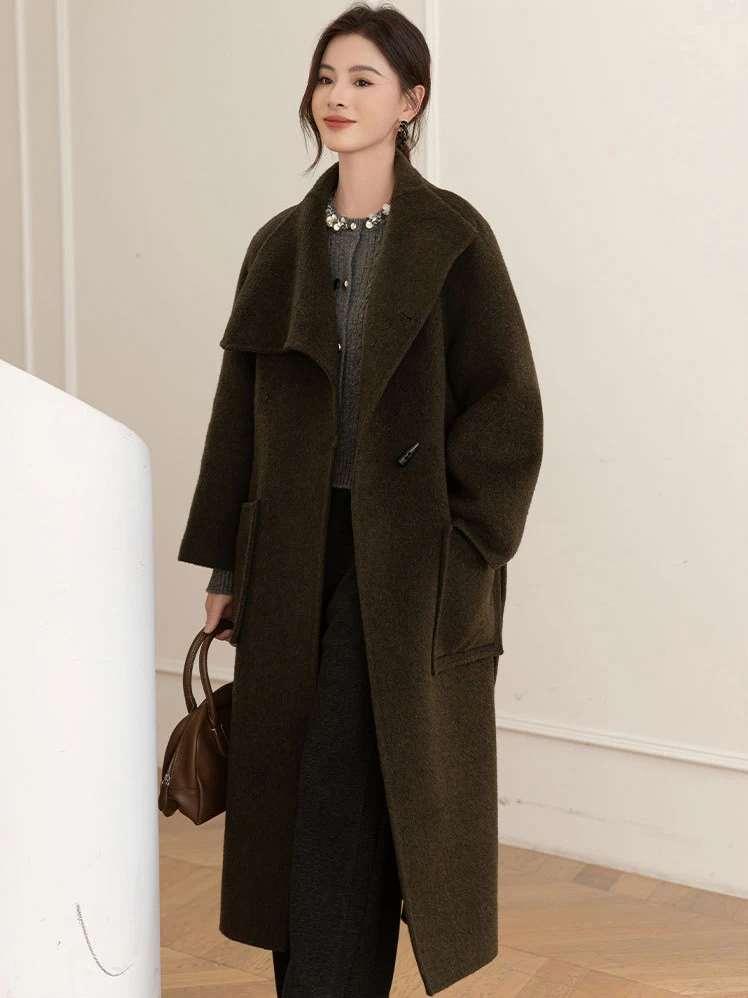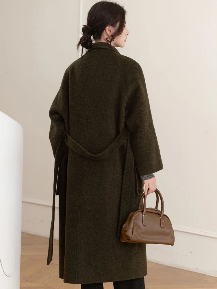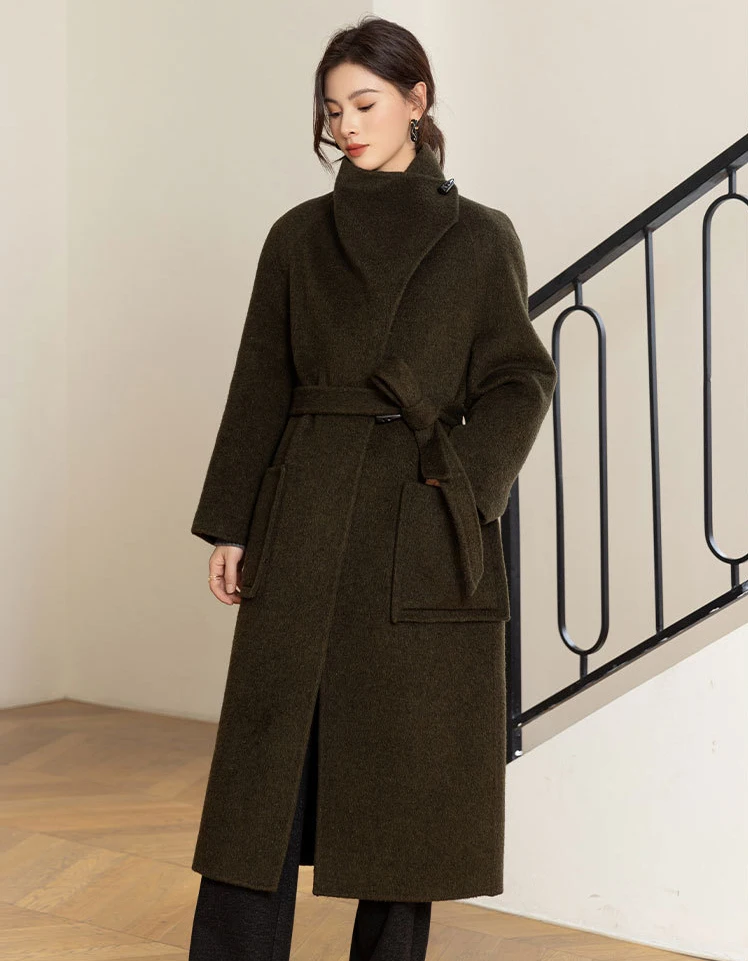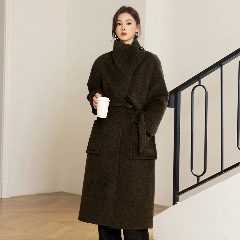 Advanced Custom Silk Yak Fur Stand Collar Wool Coat for Women Autumn/winter Warm Lace up Waist Cinching Double-sided Woolen Coat