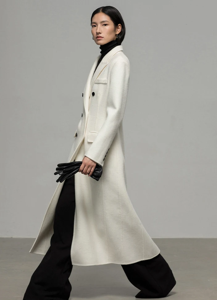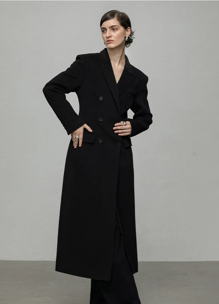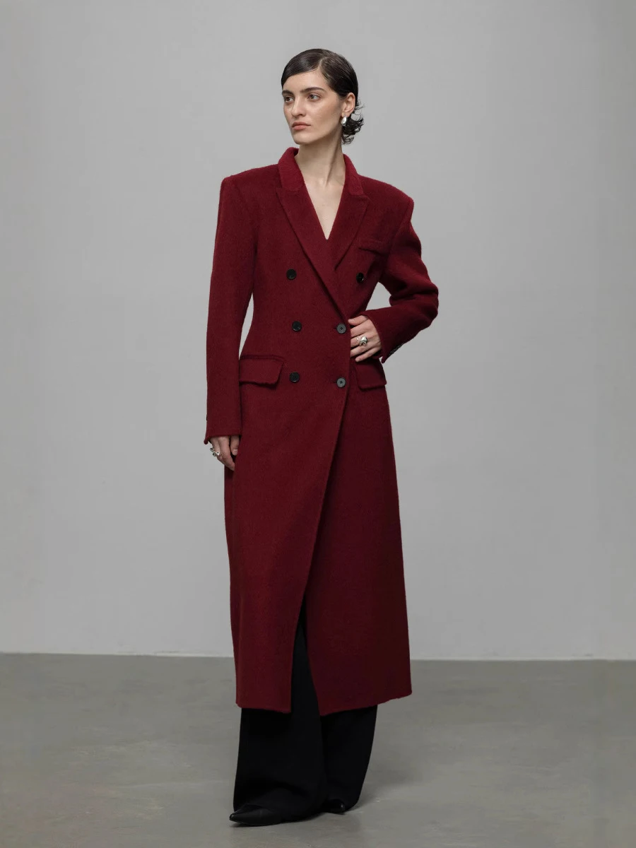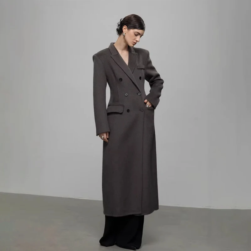 Winter High-end Shoulder Pad Double-sided Woolen Coat Women's Double Breasted Long Jacket Waist Cinching Overcoat