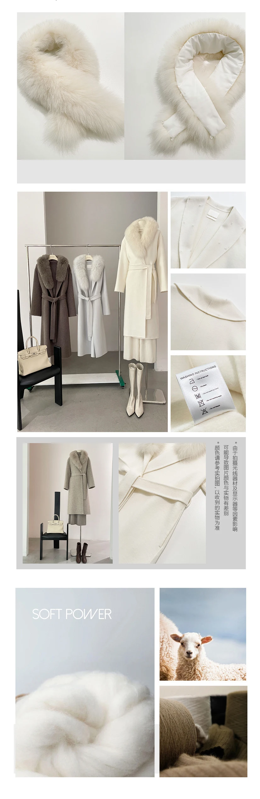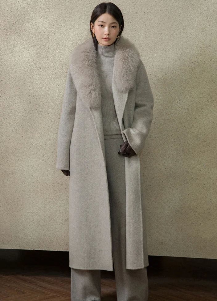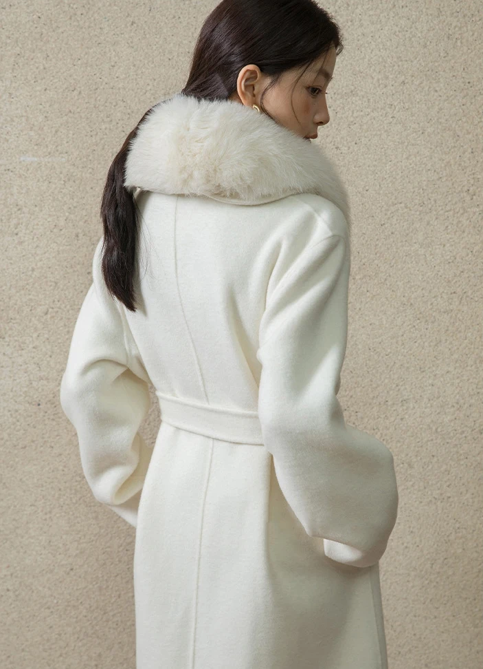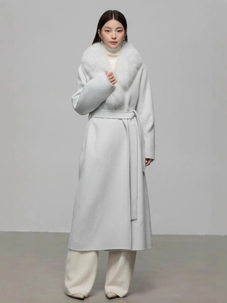 Winter New Detachable fox Fur Collar Long AlpacaSuri Coat Double Sided Handmade Woolen Lace up Coat for Women