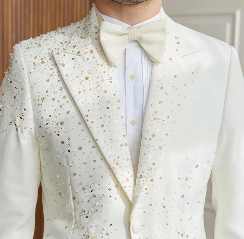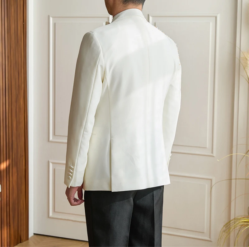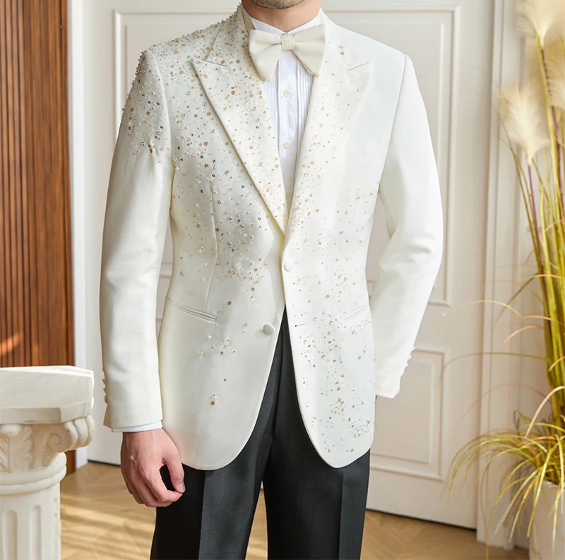 2026 New Men's White Hand-embroidered Beads Slim Groom Peaked Lapel High Quality Double Vents Suit Jacket for Men