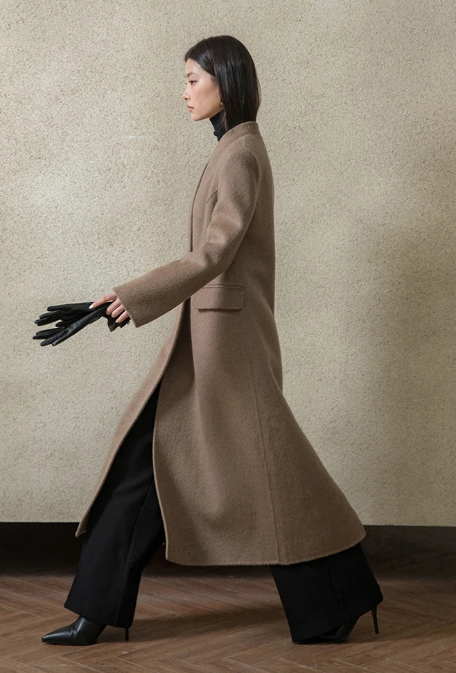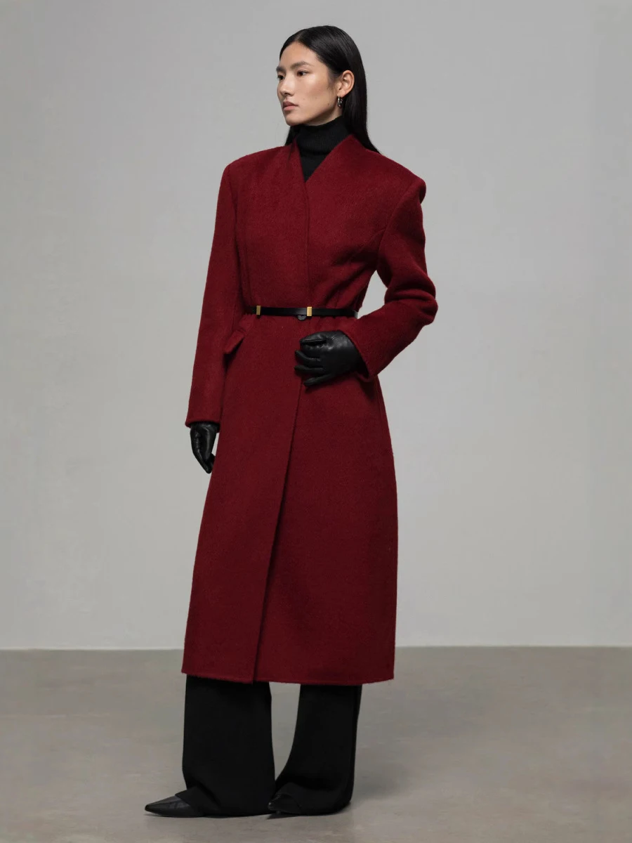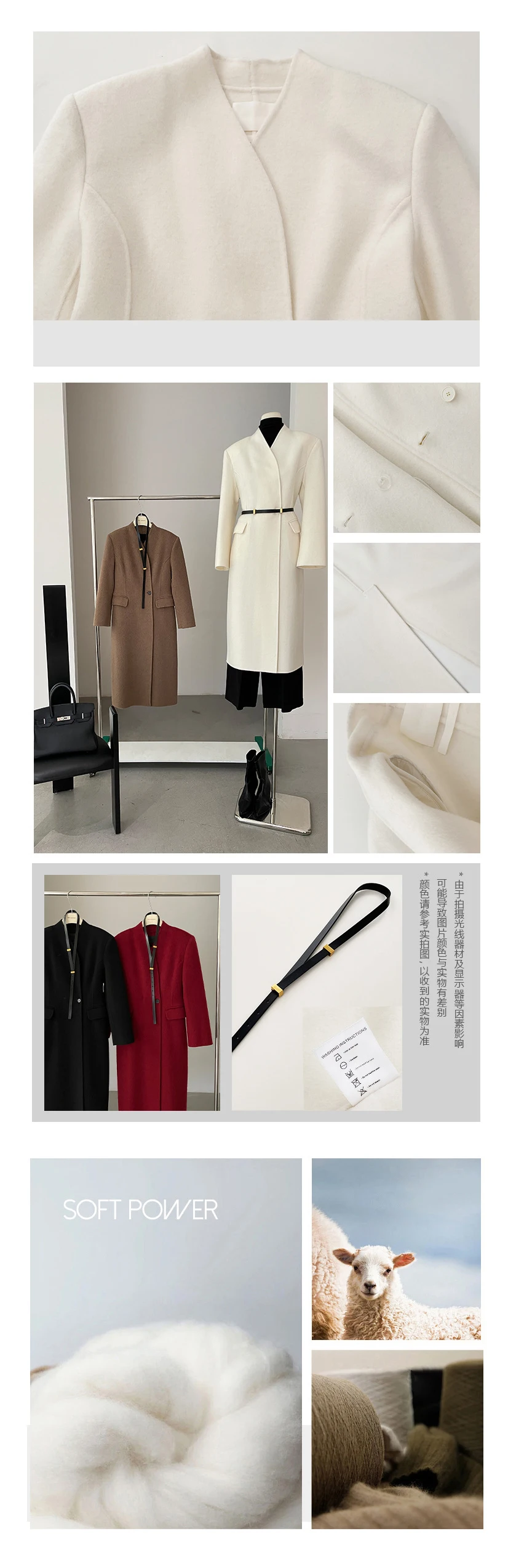 Autumn and Winter V-neck Waist Long 100% Wool Woolen Coat Single Button Shoulder Pad With Belt and Coat for Women