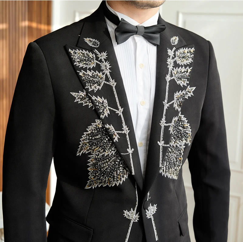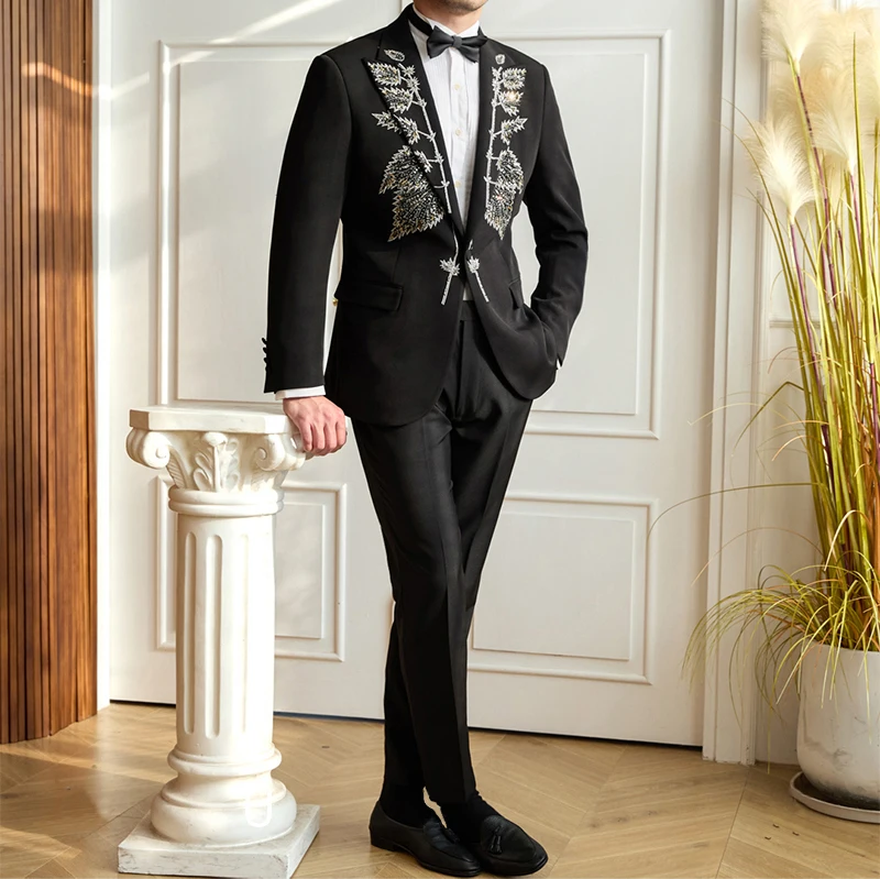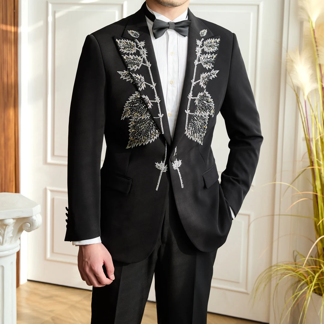 Men's Black Hand-embroidered Sequin 2 Pieces Slim Groom Peaked Lapel High Quality Double Vents Suit Set for Men