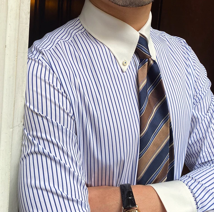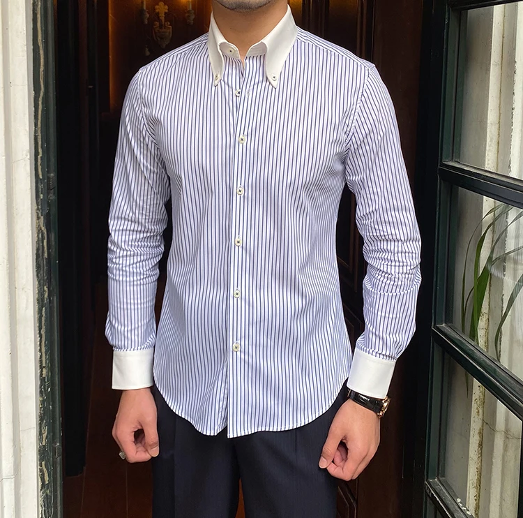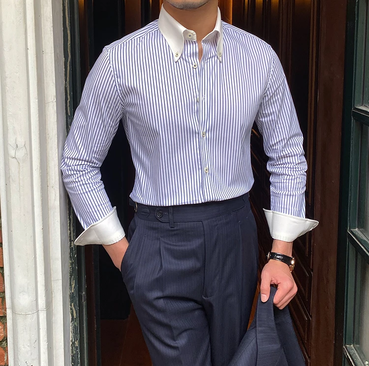 Autumn Men's Blue Lightweight 70% Cotton Striped Point Collar Shirt Casual Breathable Youth Long-sleeved Shirt for Men
