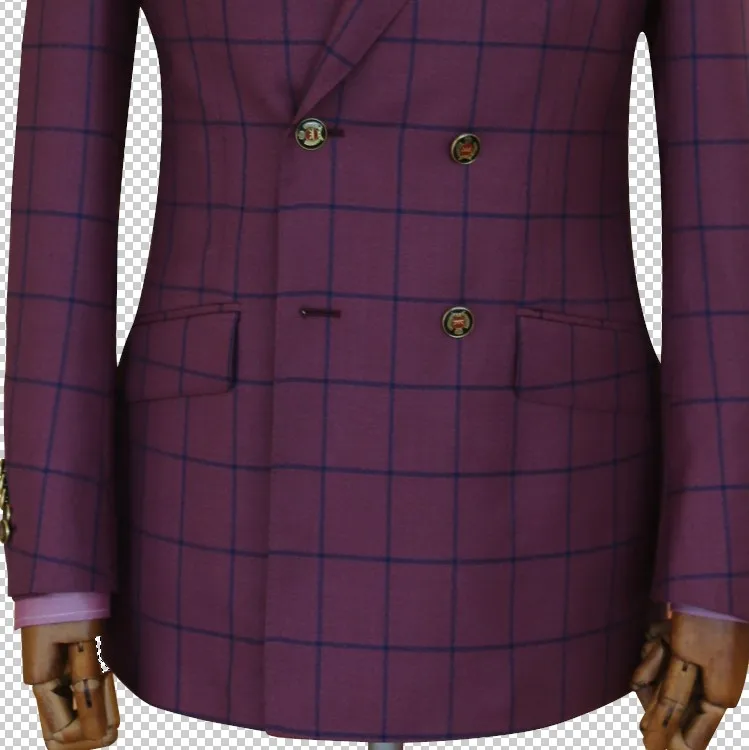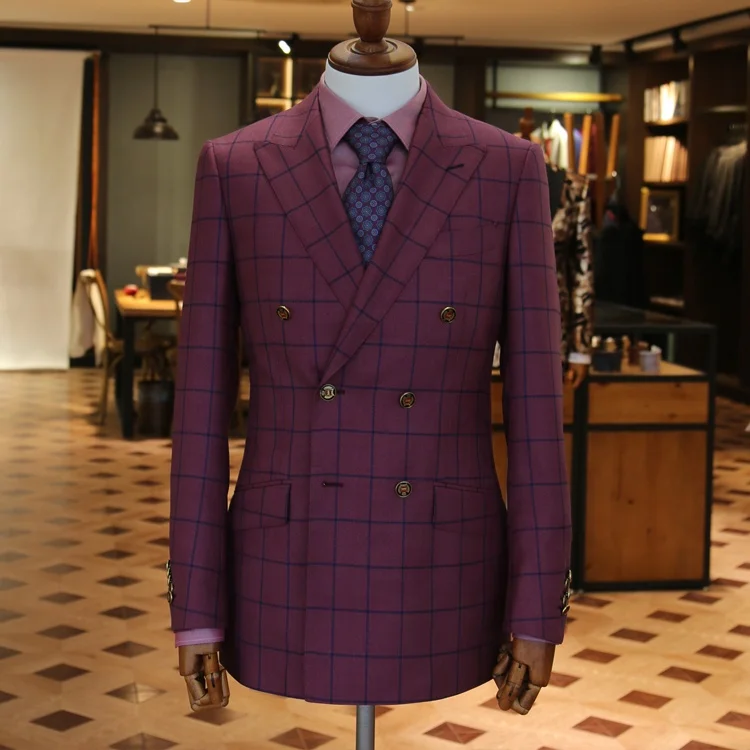 Men's Wedding Double-Breasted Tuxedo Suits Red Plaid Check Long 100% Wool Fancy Lapel Flat Plus Size Waterproof Anti-Wrinkle