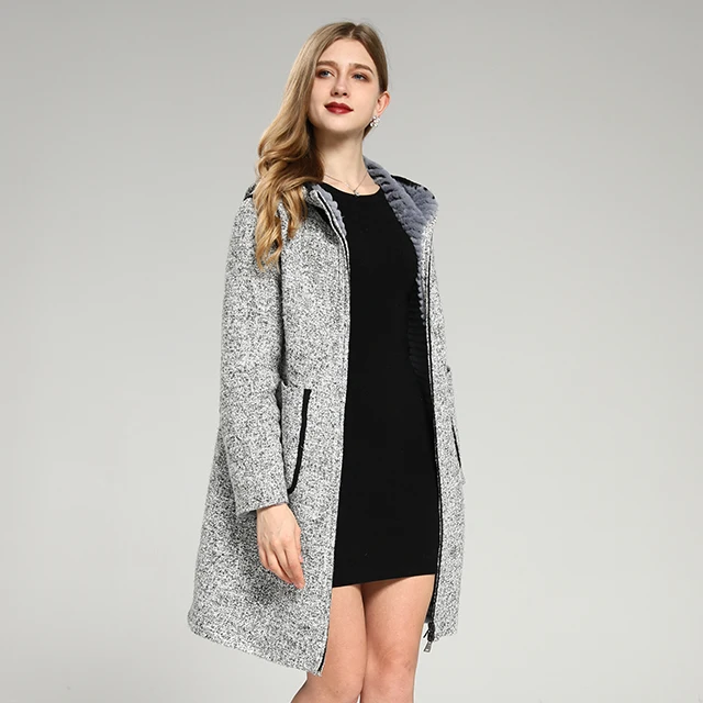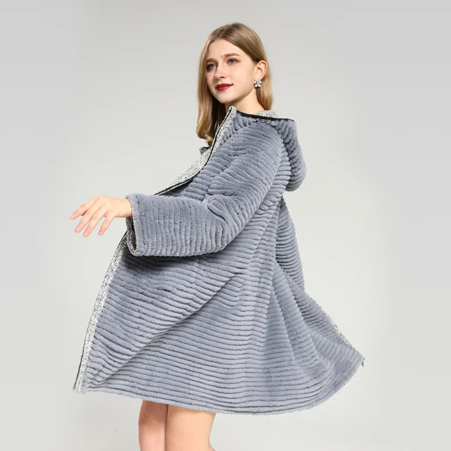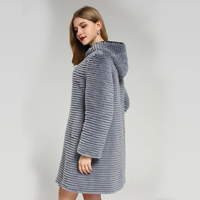 Selling Custom Size Real Rex Rabbit Skin Double-sided Hooded Long Women's Fur Coat