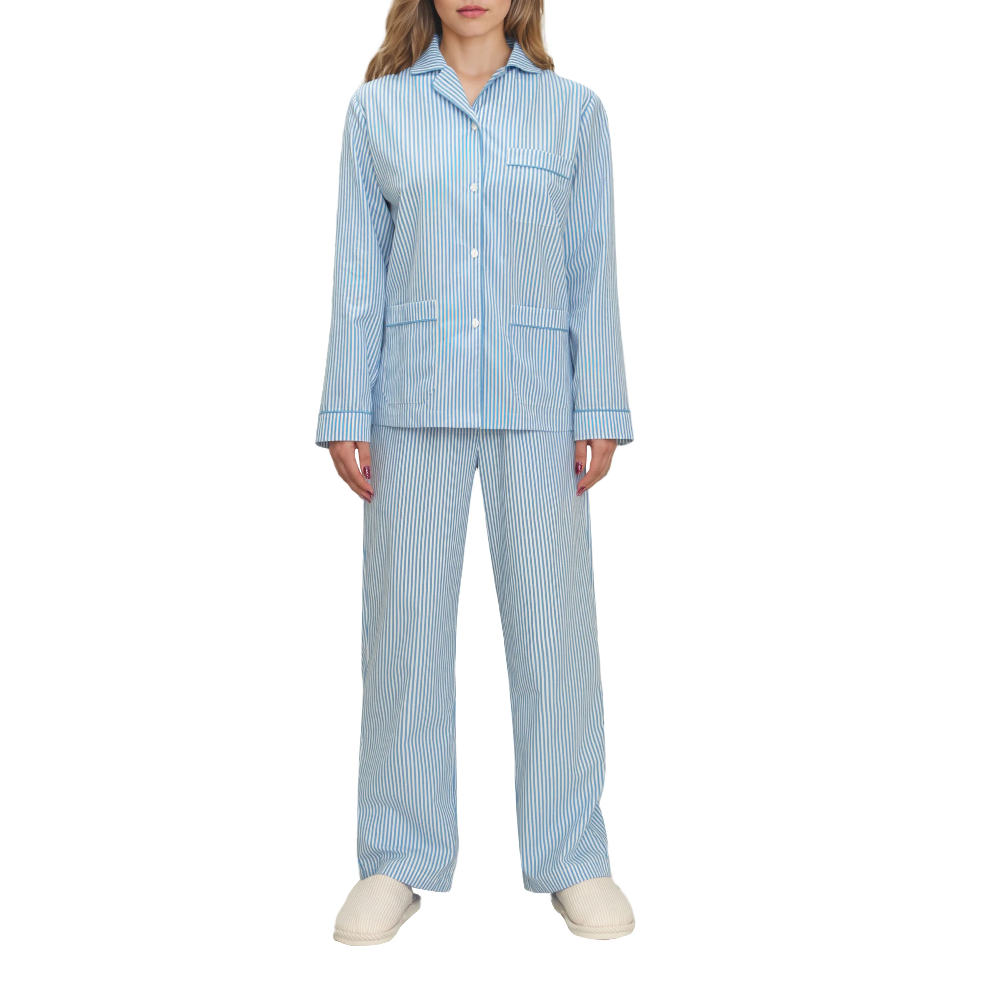 2 Pieces Striped Women's Pajamas 100% Cotton Sleepwear Lounge Wear Sets Custom Ladies Loungewear Pjs
