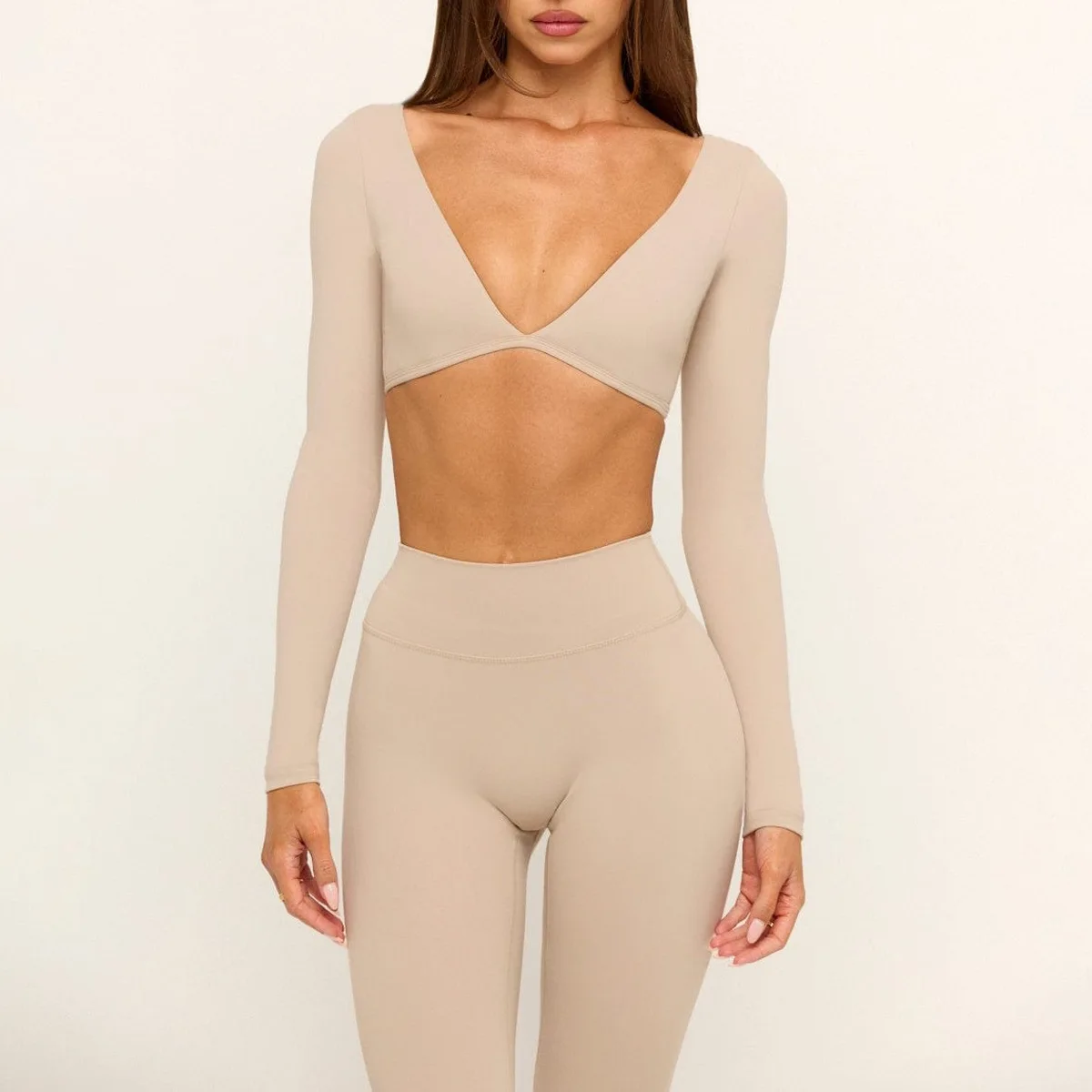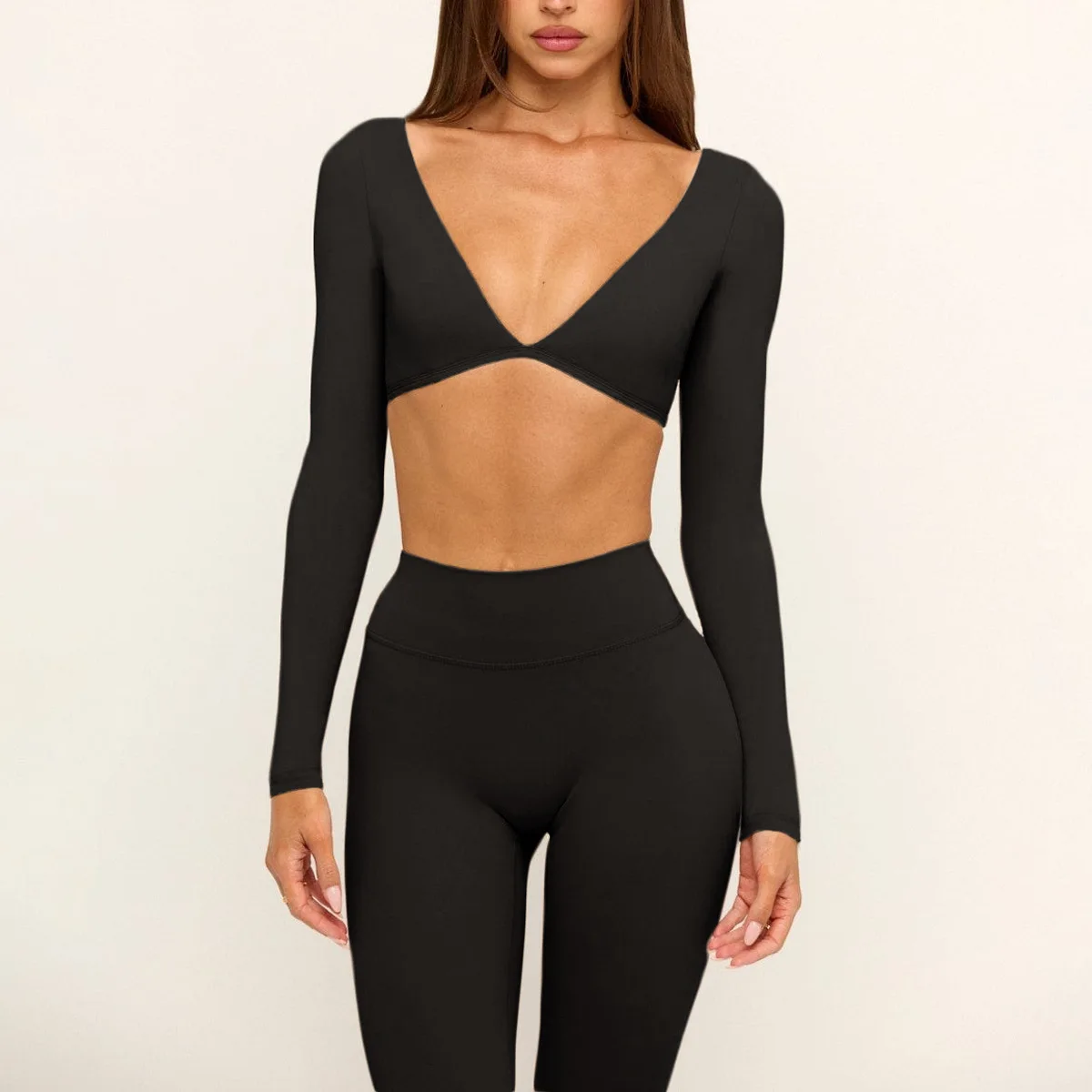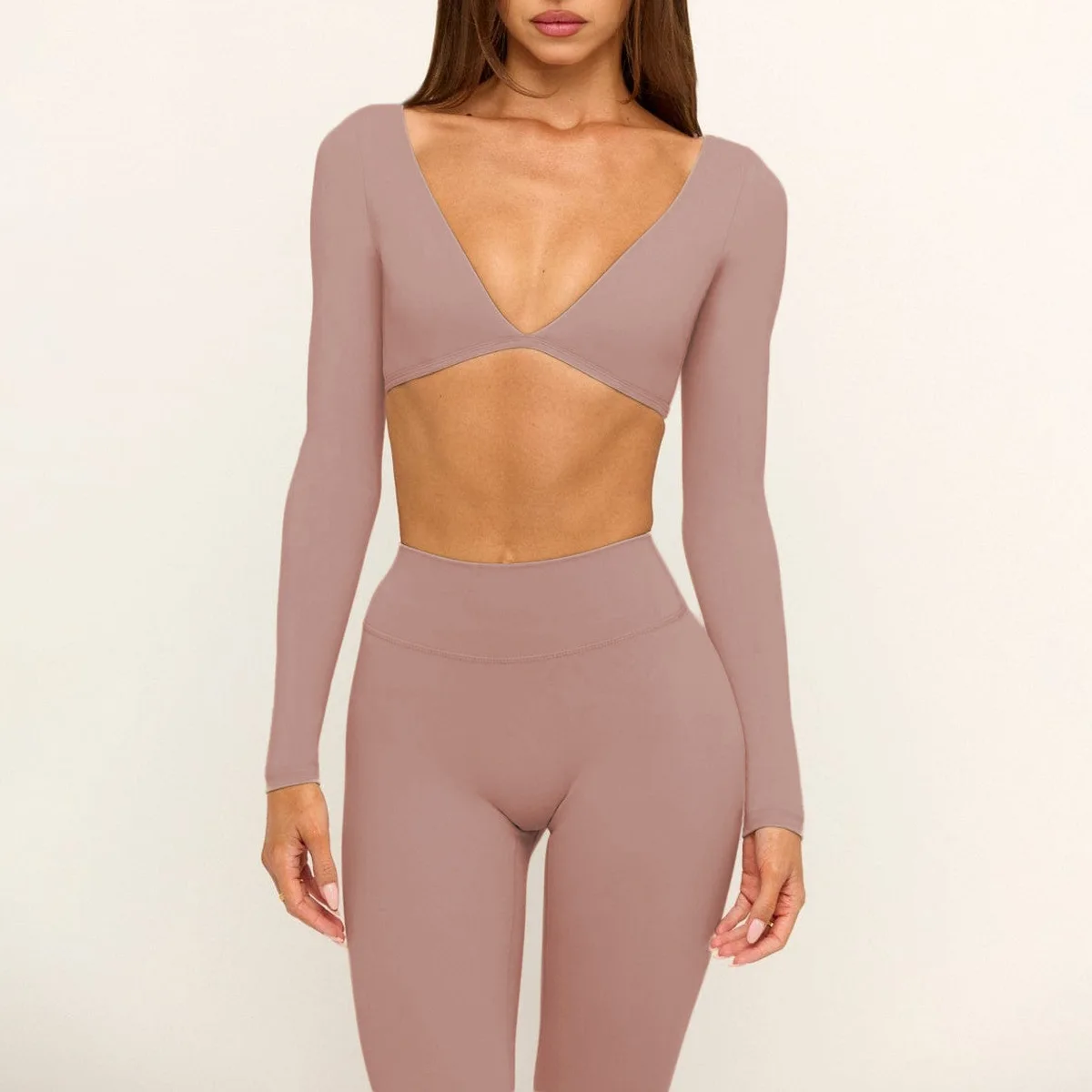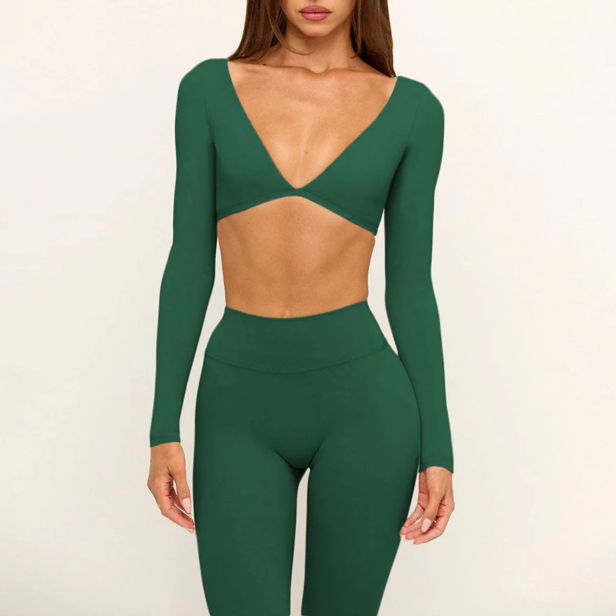 Newest Comfortable V-Neck Long Sleeve Tops Tight Leggings 2 Piece Fitness Sports Suits Women High Stretch Green Yoga Set
