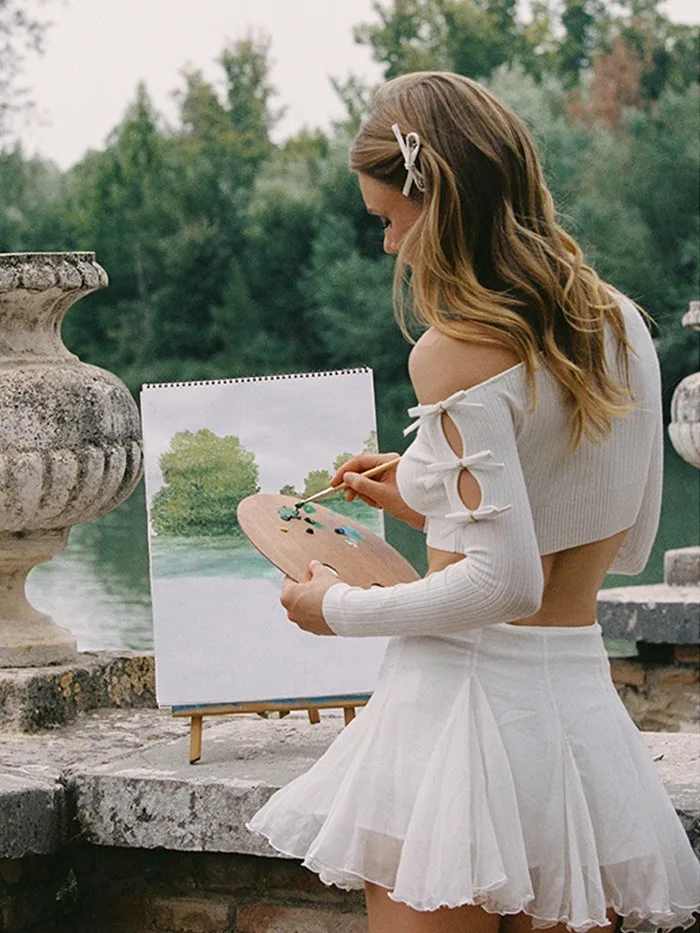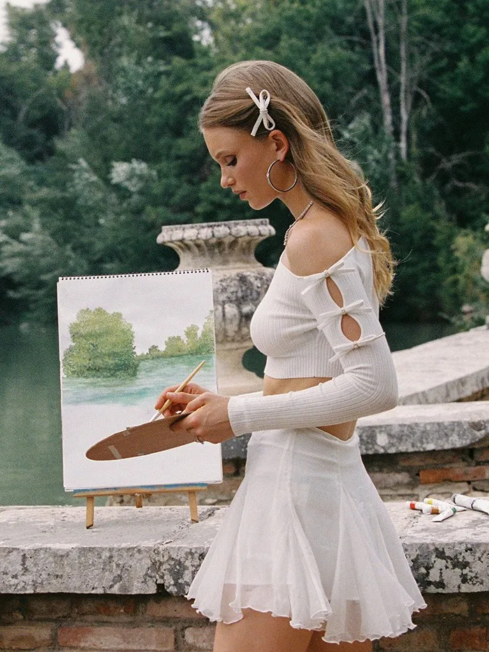 Newest Women's Sexy Outdoor Running Fitness Wear Long Sleeve Tops and Mesh Skirts Two Pieces White Yoga Sets