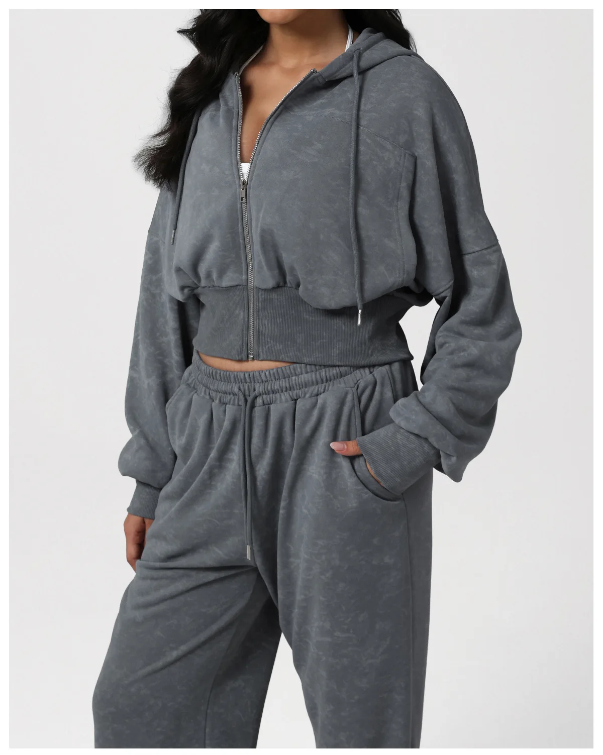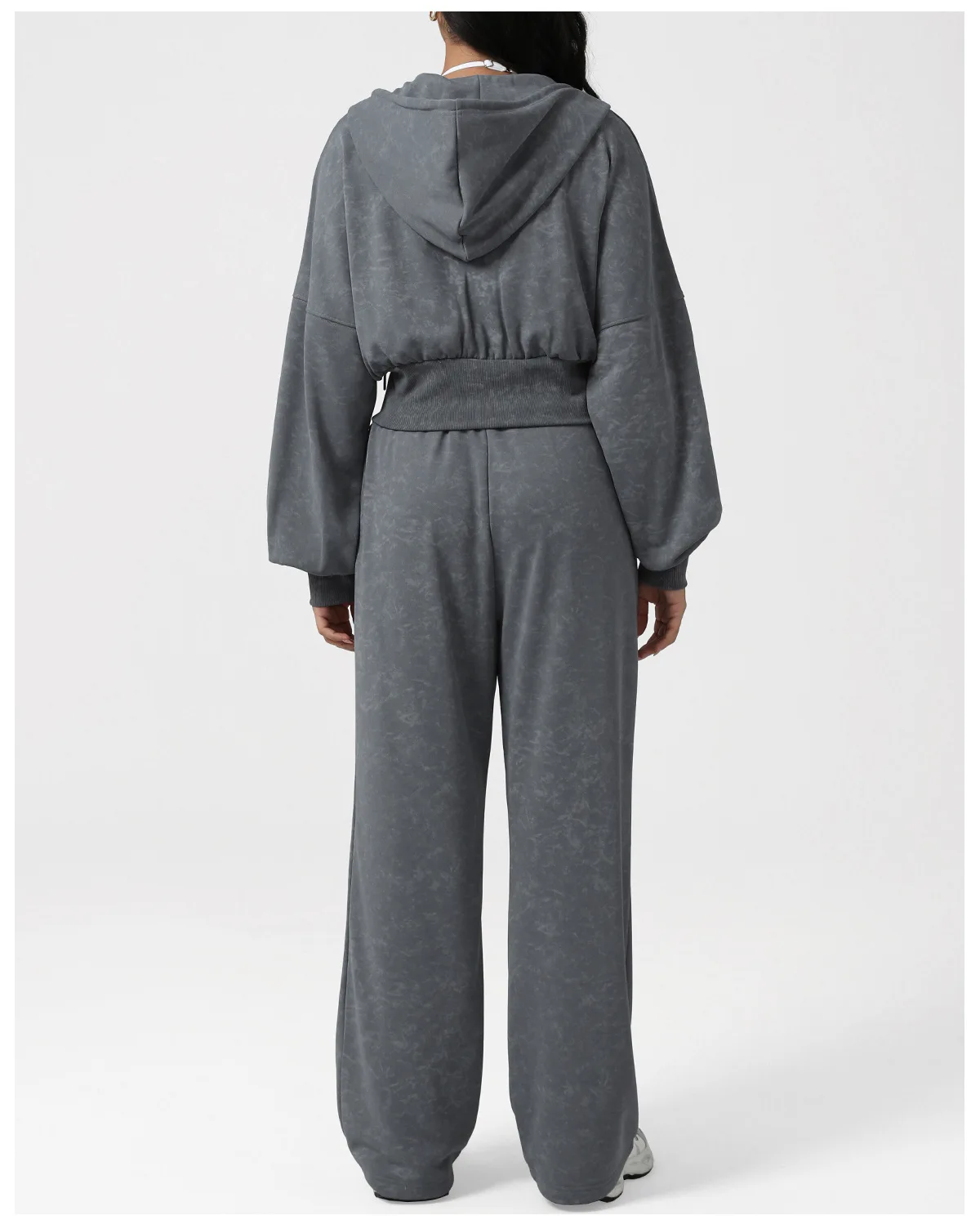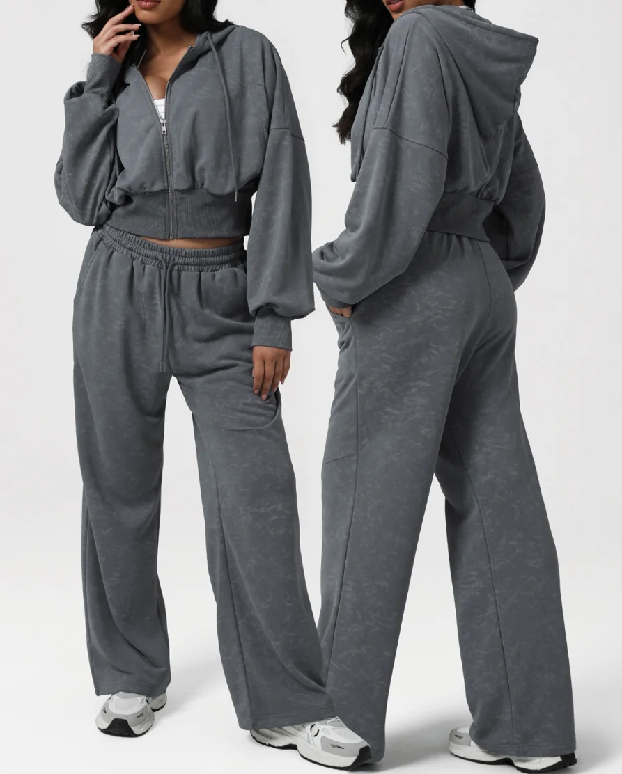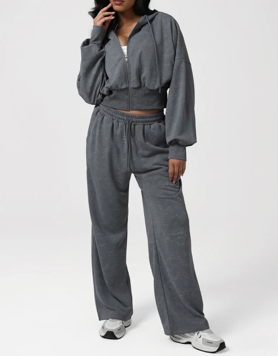 Autumn and Winter Women's Grey Hoodies and Crop Top with Wide Leg Pants Tracksuits Set Workout Jacket Fitness Sports Active Wear