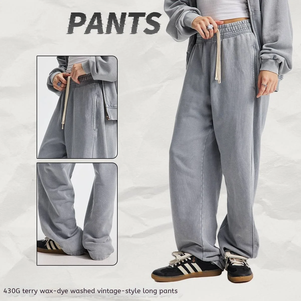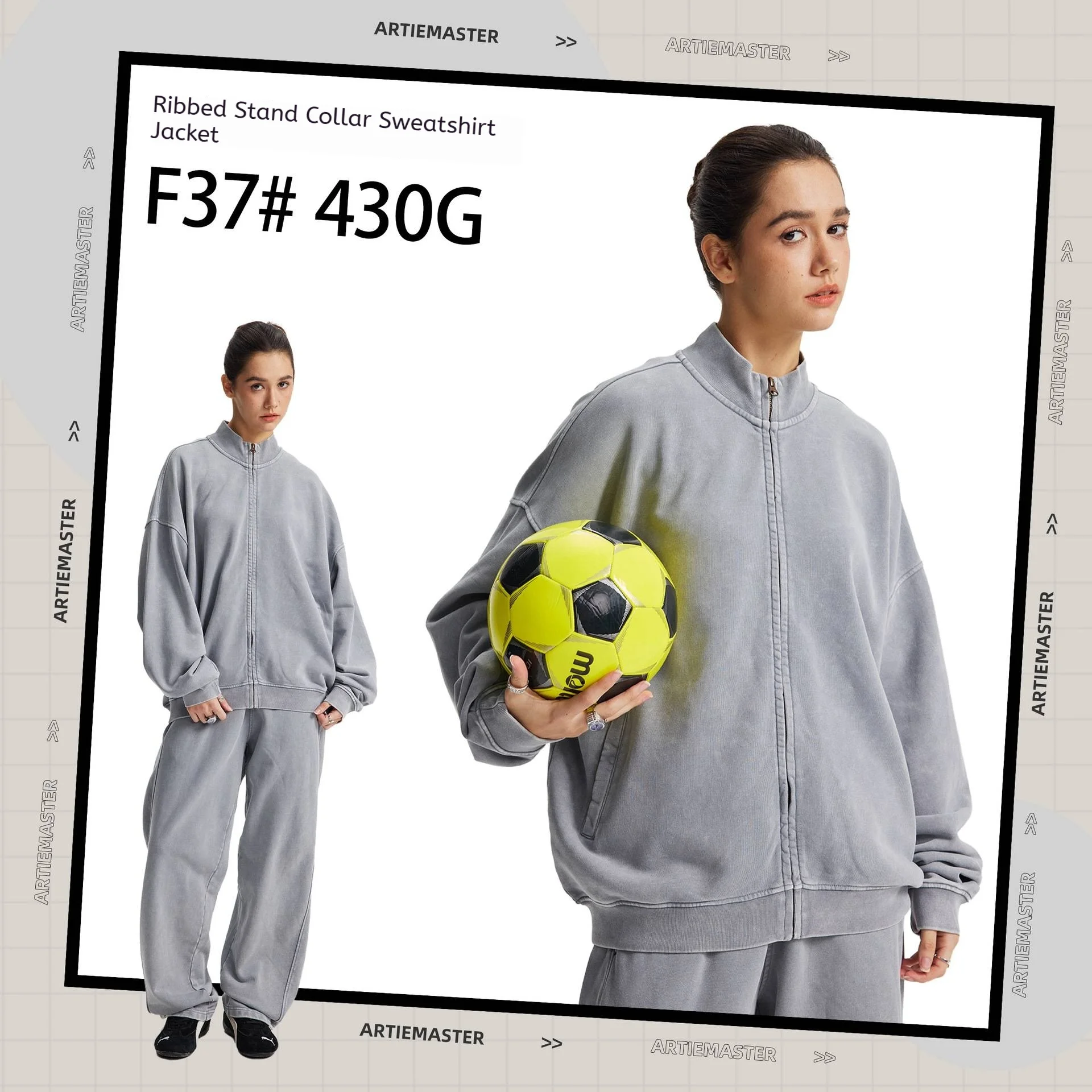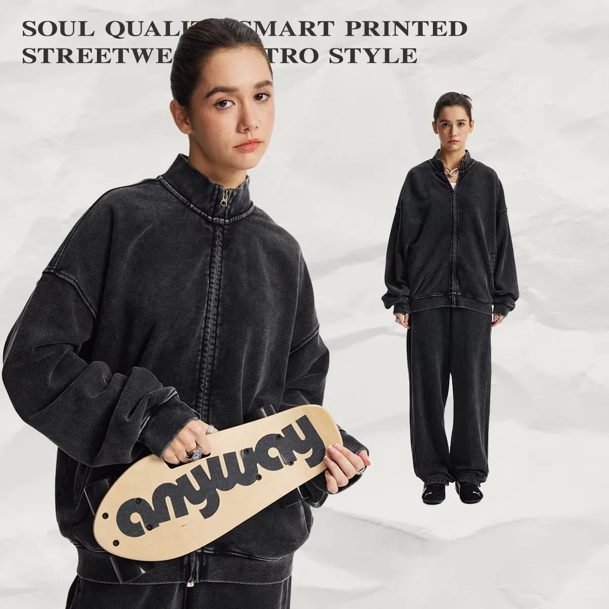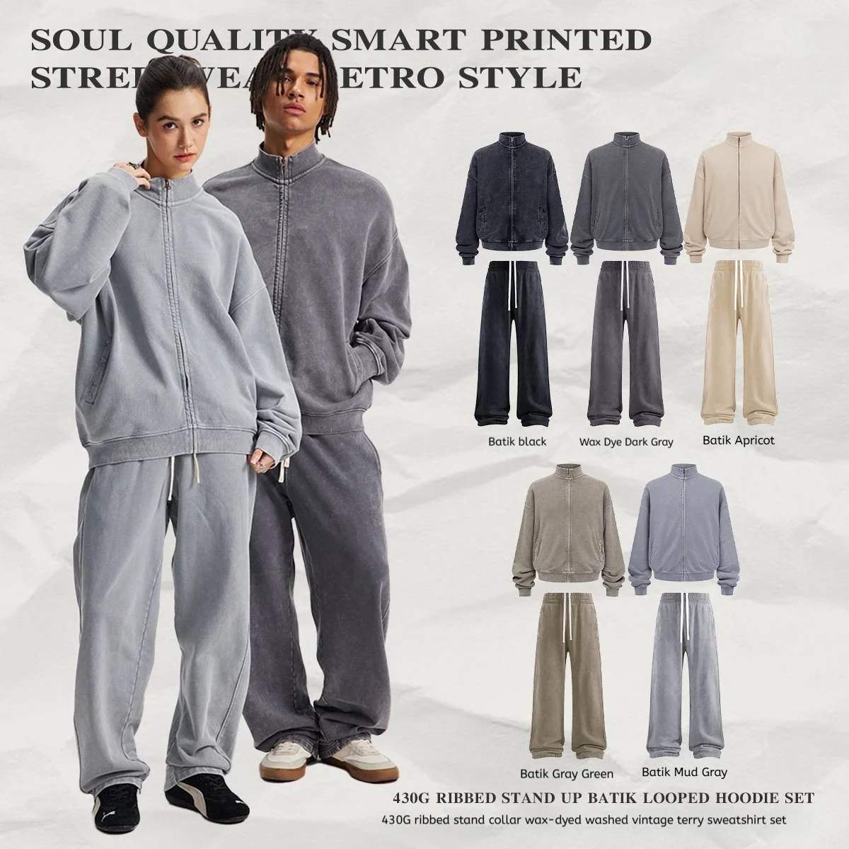 2pcs Vintage Style Heavyweight Hoodie Oversize Custom Logo Stand Collar Jacket Casual Sweatshirt and Sweatpants Set for Men