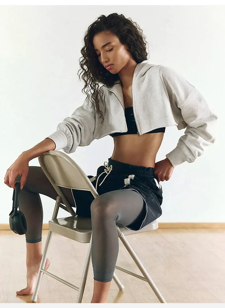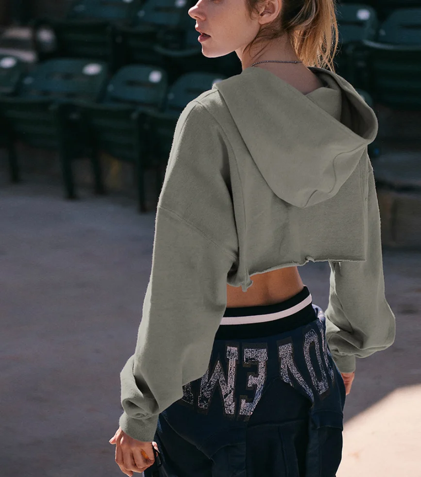 Vintage Women's Solid Color Short Cropped Zip up Clothing Long Sleeves Hoodie for Running Fitness Sport Hooded Zipper Hoodie