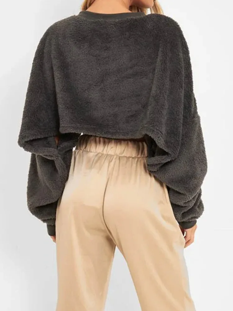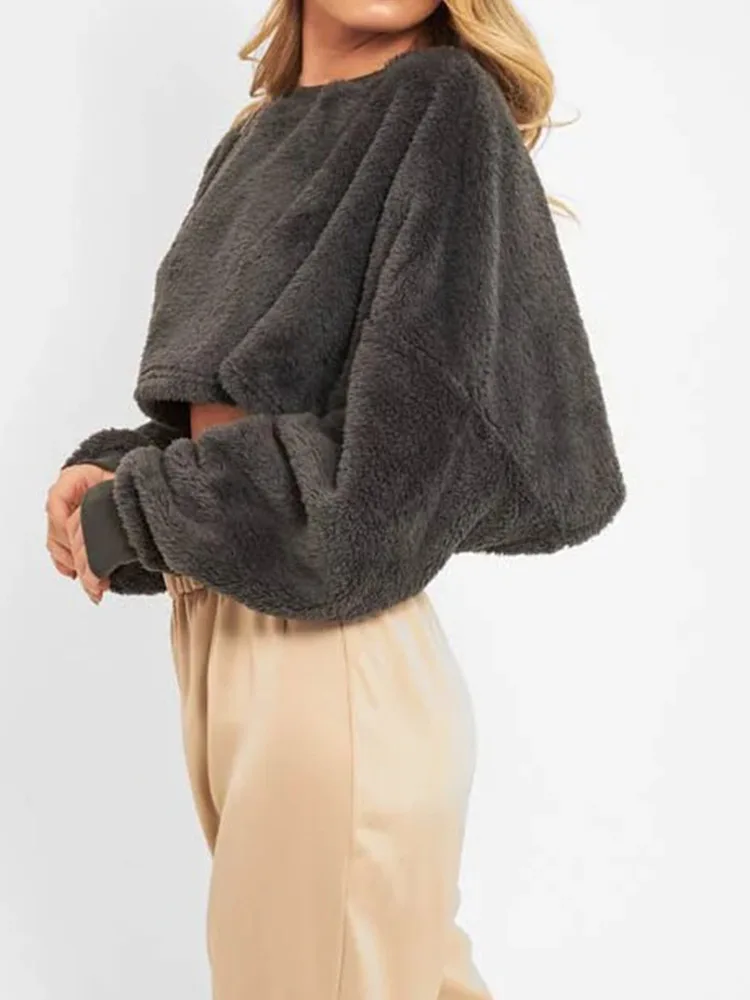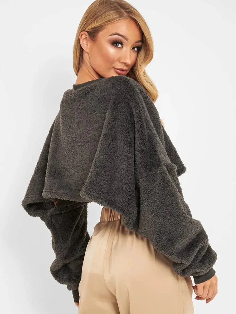 Newest Women's Winter Warm Hoodies Casual Thick French Cropped Drop Shoulder Tops Pullover Short Crop Sweatshirt for Outdoor Gym